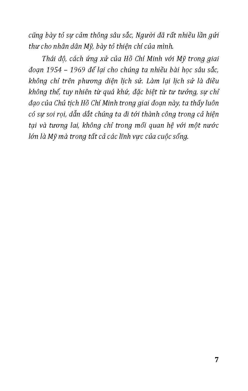 Thái độ, cách ứng xử của Hồ Chí Minh với Mỹ trong giai đoạn 1954 – 1969 để lại cho chúng ta nhiều bài học sâu sắc, không chỉ trên phương diện lịch sử. Làm lại lịch sử là điều không thể, tuy nhiên từ quá khứ, đặc biệt từ tư tưởng, sự chỉ đạo của Chủ tịch Hồ Chí Minh trong giai đoạn này, ta thấy luôn có sự soi rọi, dẫn dắt chúng ta đi tới thành công trong cả hiện tại và tương lai, không chỉ trong mối quan hệ với một nước lớn là Mỹ mà trong tất cả các lĩnh vực của cuộc sống.