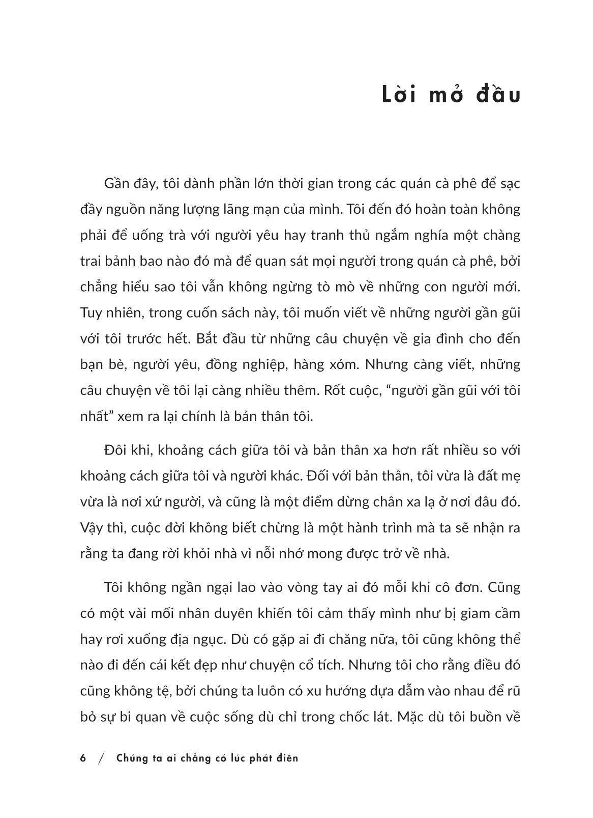 “Chúng ta ai chẳng có lúc phát điên” là tập hợp những câu chuyện về khó khăn trong các mối quan hệ của cuộc sống mà ai cũng đã hoặc đang phải đối mặt hàng ngày nhưng có thể chưa biết cách vượt qua: người sếp độc hại, cha mẹ khắt khe, người yêu đòi hỏi, bạn bè không hiểu cho tâm tư của chúng ta, Và hàng loạt những căn bệnh tâm lý xuất hiện trong một xã hội dù tiện nghi được đẩy lên cao nhưng tình cảm giữa con người thì ngày càng xa cách: chứng rối loạn tăng động giảm chú ý, căn bệnh trầm cảm – bóng ma của thời đại, chứng sợ xã hội,