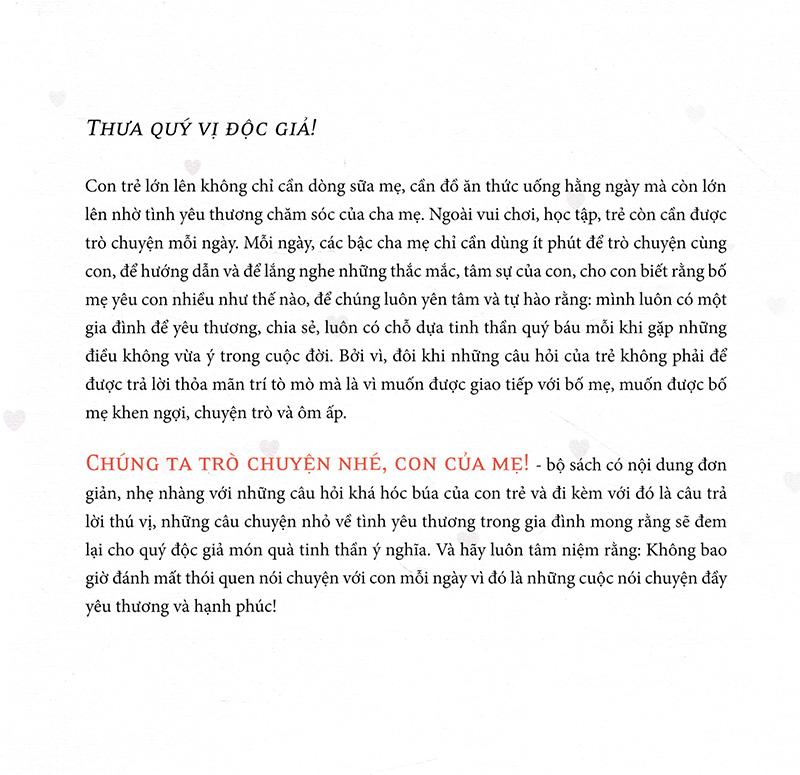 Ở những năm đầu đời, các con như những búp lá non ngây thơ và trong sáng, các con tiếp xúc với nhiều người, nhiều việc và cũng từ đó nảy sinh rất nhiều rắc rối. Các con có những thắc mắc rất dễ thương, đôi khi còn gây không ít khó khăn cho cha mẹ. Từ chuyện trong nhà, đến chuyện bạn bè, từ những thói quen đến nỗi sợ hã tất cả đều cần sự giúp đỡ, dẫn dắt của cha mẹ. Chính sự gần gũi trò chuyện cùng con sẽ giúp cha mẹ định hướng hình thành nhân cách cho con đồng thời đem đến cho con những năm tháng êm đềm hạnh phúc nhất.
