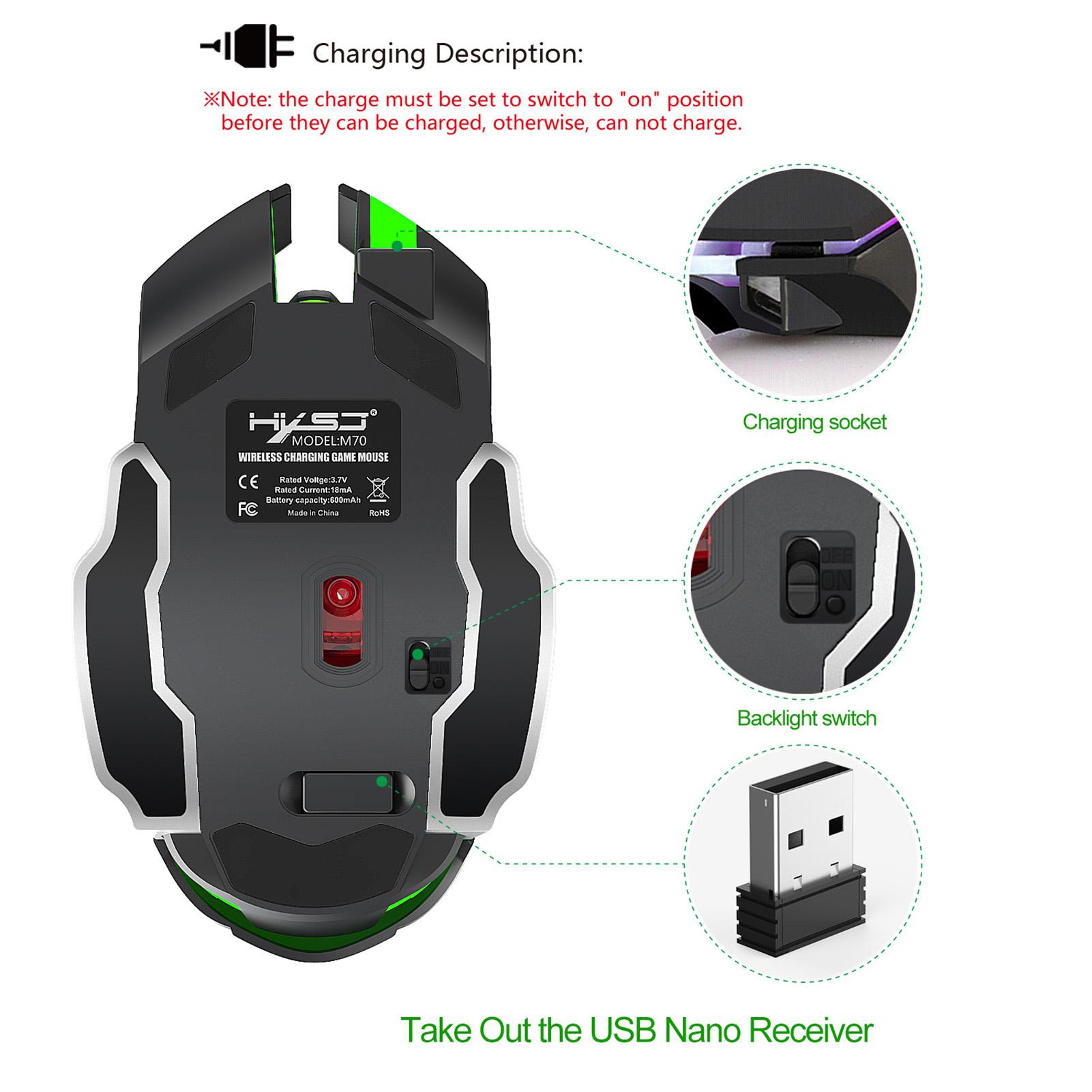 Description HXSJ M702.4GWireless Rechargeable Mouse is thelatest HXSJbrand wireless gaming mouse, with six buttons and seven colors of the breathing light. It is suitable for game lovers. Ergonomic surface to reduce hand fatigue and 4