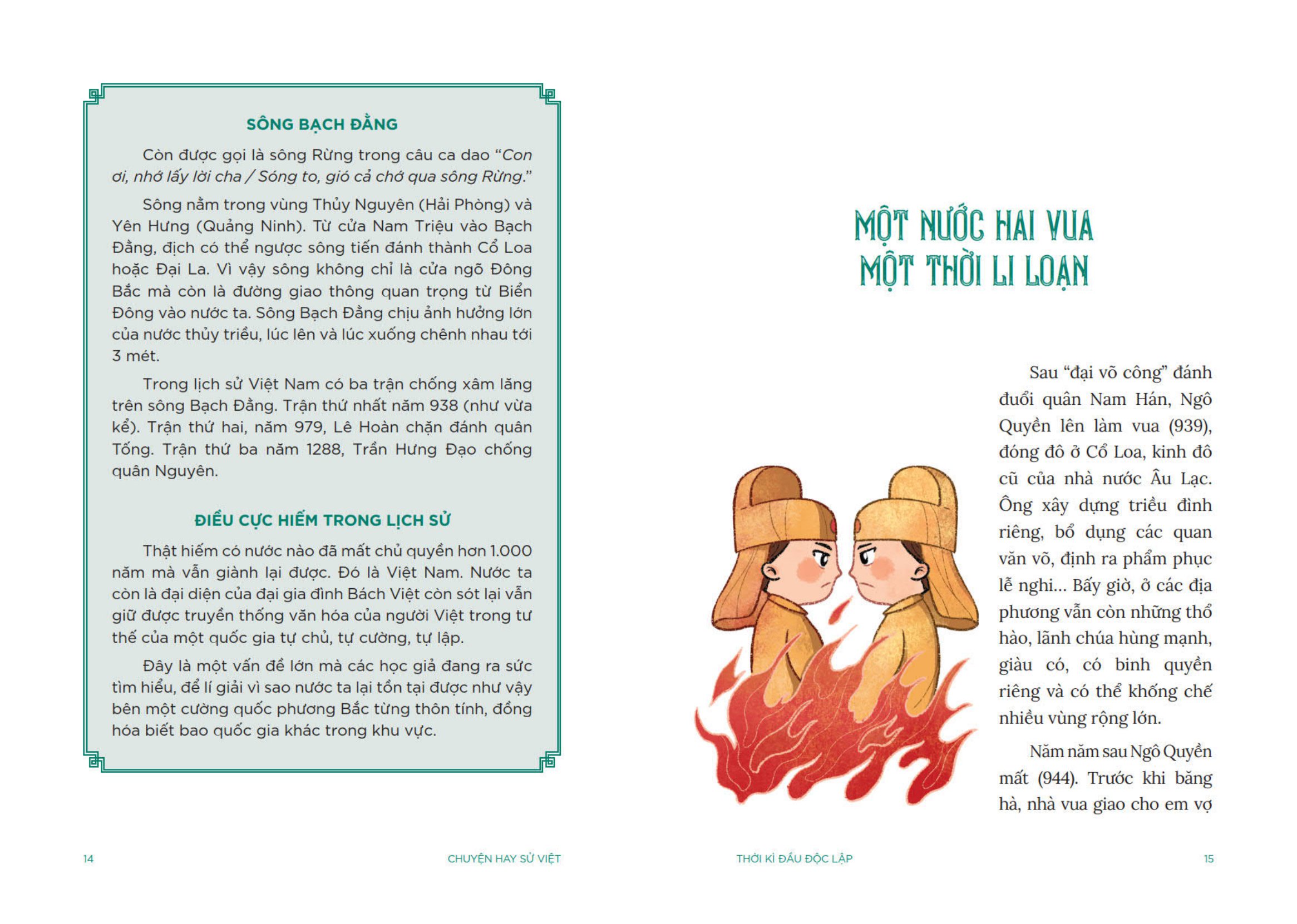 Mã hàng 8935244897302 Độ Tuổi 6 - 15+ Tên Nhà Cung Cấp Nhà Xuất Bản Kim Đồng Tác giả Nguyễn Như Mai, Nguyễn Quốc Tín, Nguyễn Huy Thắng NXB Kim Đồng Năm XB 2024 Ngôn Ngữ Tiếng Việt Trọng lượng (gr) 175 Kích Thước Bao Bì 20.5 x 14.5 x 0.6 cm Số trang 132 Hình thức Bìa Mềm Chuyện Hay Sử Việt - Thời Kì Đầu Độc Lập - Khai Mở Nền Tự Chủ Lịch sử đất nước đã trải qua hàng nghìn năm với biết bao thời khắc huy hoàng và bi tráng. Bộ sách Chuyện Hay Sử Việt sẽ dẫn dắt bạn đọc đi ngược dòng thời gian, thông qua những sự kiện hào hùng, câu chuyện về những nhân vật được ghi trong chính sử và cả các huyền tích, giai thoại lưu truyền trong dân gian. Thời Kì Đầu Độc Lập – Khai Mở Nền Tự Chủ làcuộcgặp với các gương mặt danh nhân: Ngô Quyền, Đinh Bộ Lĩnh, Lê Hoàn… Những triều đại phong kiến sơ khai do họ dựng lên có vai trò khai mở cho nền độc lập tự chủ của Việt Nam. Cùng với những minh họa sống động, gần gũi, đời sống của người xưa, bộ sách Chuyện Hay Sử Việt làm sống dậy những suy nghĩ và tình cảm, mưu cầu và khát khao của họ trên từng trang sách, giúp các bạn trẻ hiểu rõ hơn về chặng đường quá khứ mà ông cha ta đã đi qua và góp phần tăng thêm lòng tự hào dân tộc, thêm yêu lịch sử nước nhà và có ý thức hơn về trách nhiệm đối với đất nước.