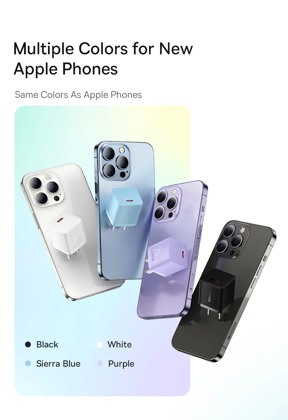 - Cùng màu với điện thoại iPhone : Trắng, xanh, tím, đen.