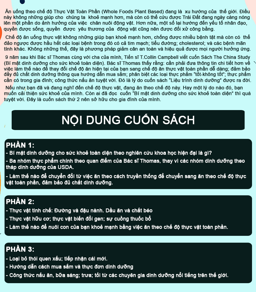 Chín năm sau khi Bác sĩ Thomas cùng với cha của mình, Tiến sĩ T.Collin Campbell viết cuốn Sách The China Study (Bí mật dinh dưỡng cho sức khoẻ toàn diện). Bác sĩ Thomas thấy rằng: cần phải đưa thông tin chi tiết hơn về việc làm thế nào để thay đổi chế độ ăn hiện tại của bạn sang chế độ ăn thực vật toàn phần dễ dàng; đảm bảo đầy đủ chất dinh dưỡng thông qua hướng dẫn mua sắm; phân biệt các loại thực phẩm “tốt – không tốt”; thực phẩm cần có trong gia đình; công thức nấu ăn tuyệt vời. Đó là lý do cuốn sách “Liệu trình dinh dưỡng” được ra đời.