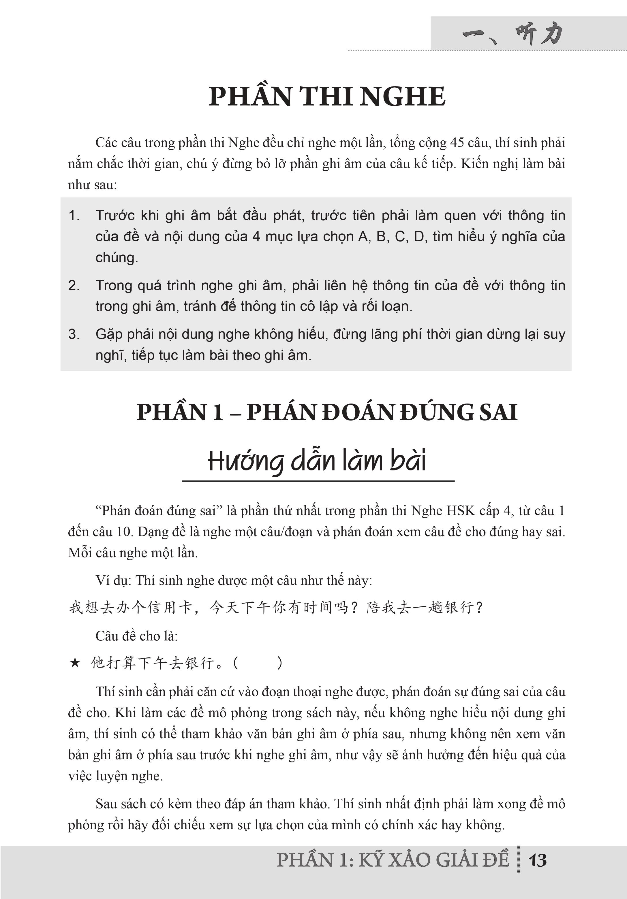 - Phần 2: Đề thi mô phỏng - cung cấp 12 bộ đề thi mô phỏng được biên soạn sát với đề thi thực của kỳ thi HSK cấp 4.