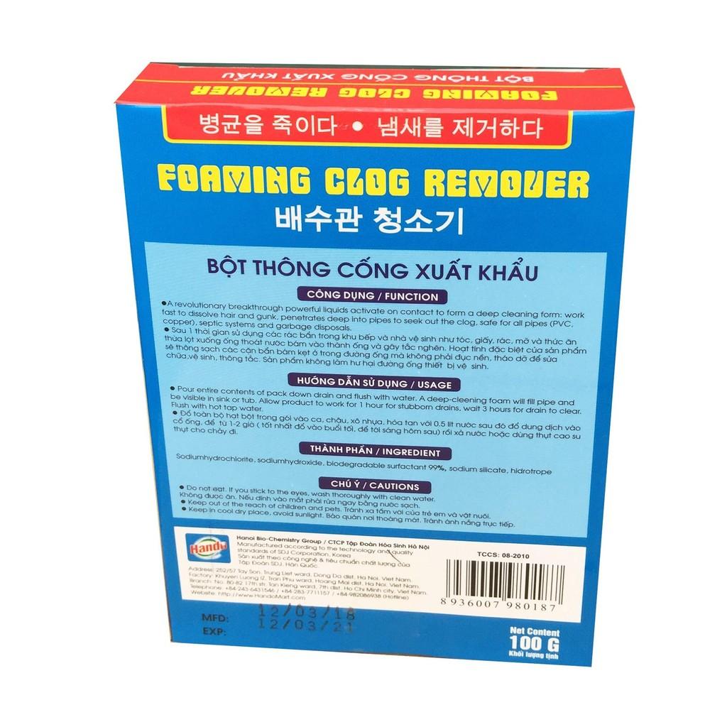 Thông tin sản phẩm Tên sản phẩm : Bột thông cống xuất khẩu Hando 100Gr Thành phần : Nước, hydrogen peroxide, sodium silicat, sodiumhypo chlorite Công dụng : Thông cống, chống phá tắc nghẽn Hướng