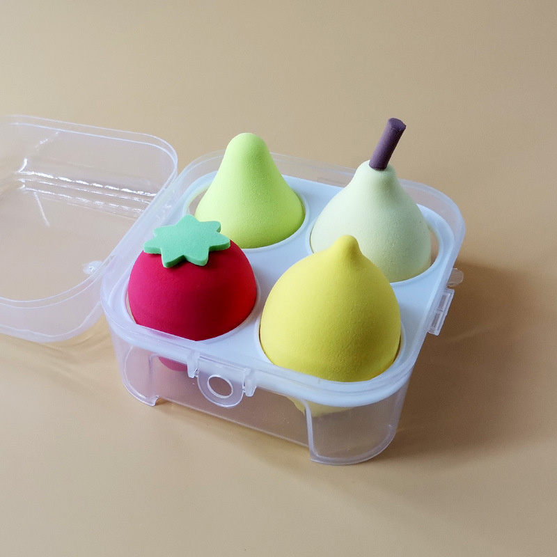 -Hộp bông tán phấn trang điểm 4 món hình trái cây xinh xắn nhiều màu , có hộp đựng siêu đáng yêu cute -Xuất xứ : Trung Quốc -Chất liệu : cao su non ưa
