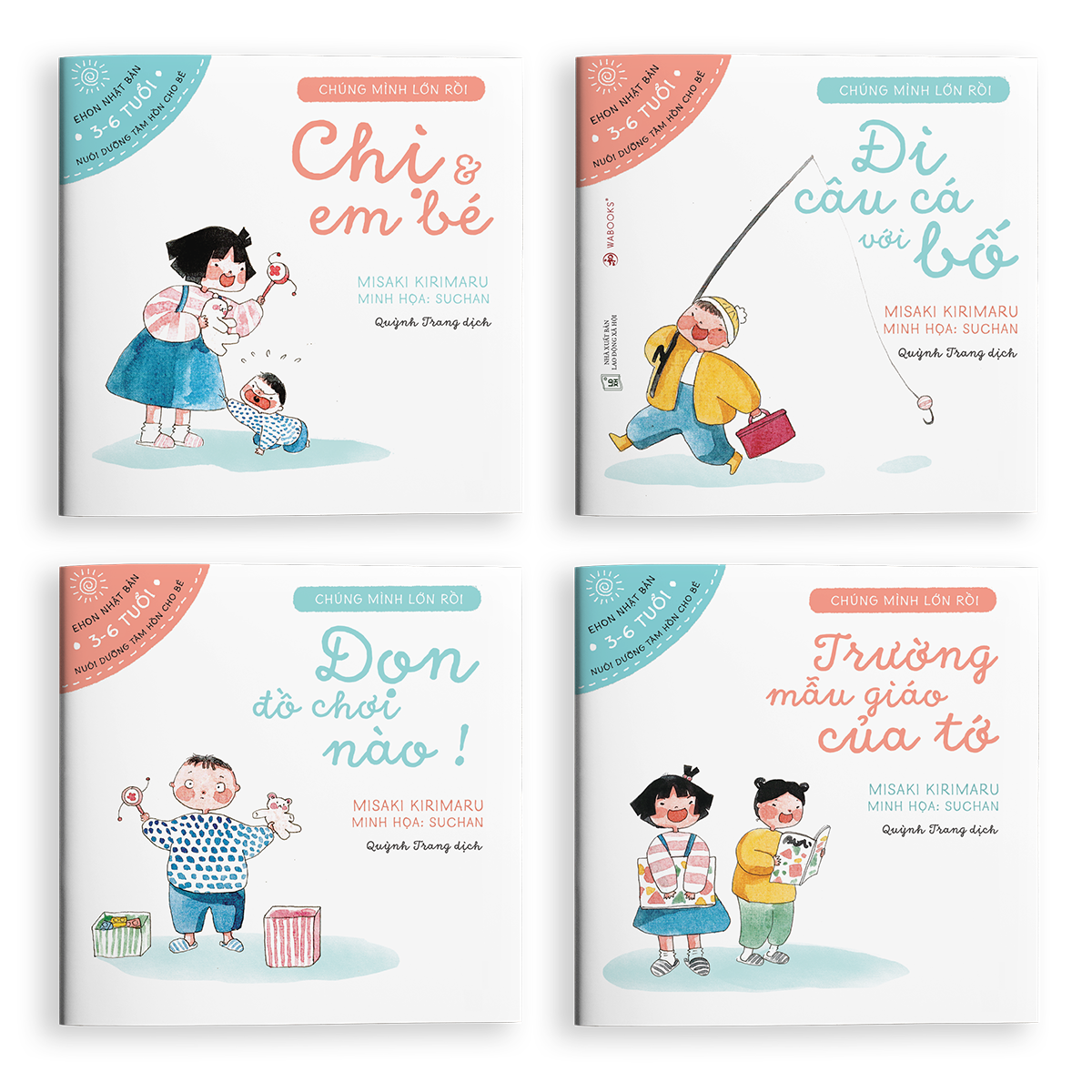 “Chúng mình lớn rồi” là bộ sách Ehon 4 cuốn gồm “Dọn đồ chơi nào!”, “Đi câu cá với bố”, “Trường mẫu giáo của tớ”, “Chị và em bé” dành cho trẻ từ 3-6 tuổi.