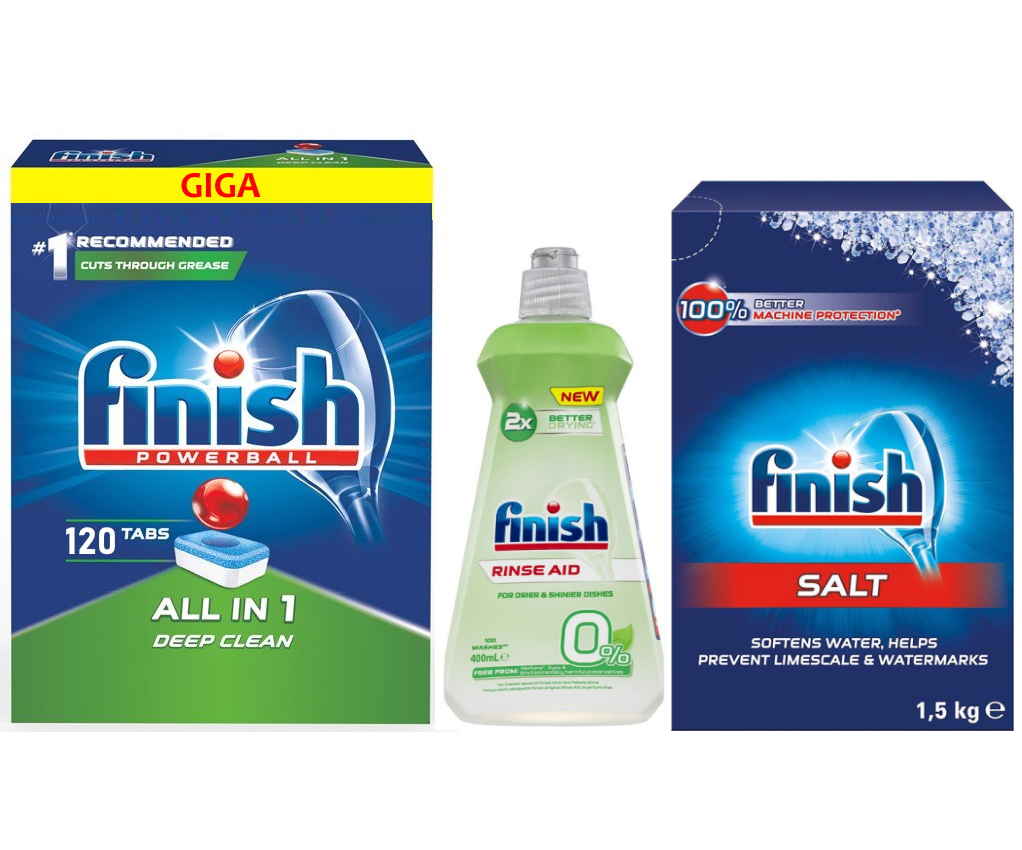 - viên rửa bát finish 120 viên + muối finish 1.2kg + Nước làm bóng finish 400ml dùng cho máy rửa bát Viên rửa bát Finish 120 viên nhập khẩu từ đức chuyên dùng cho