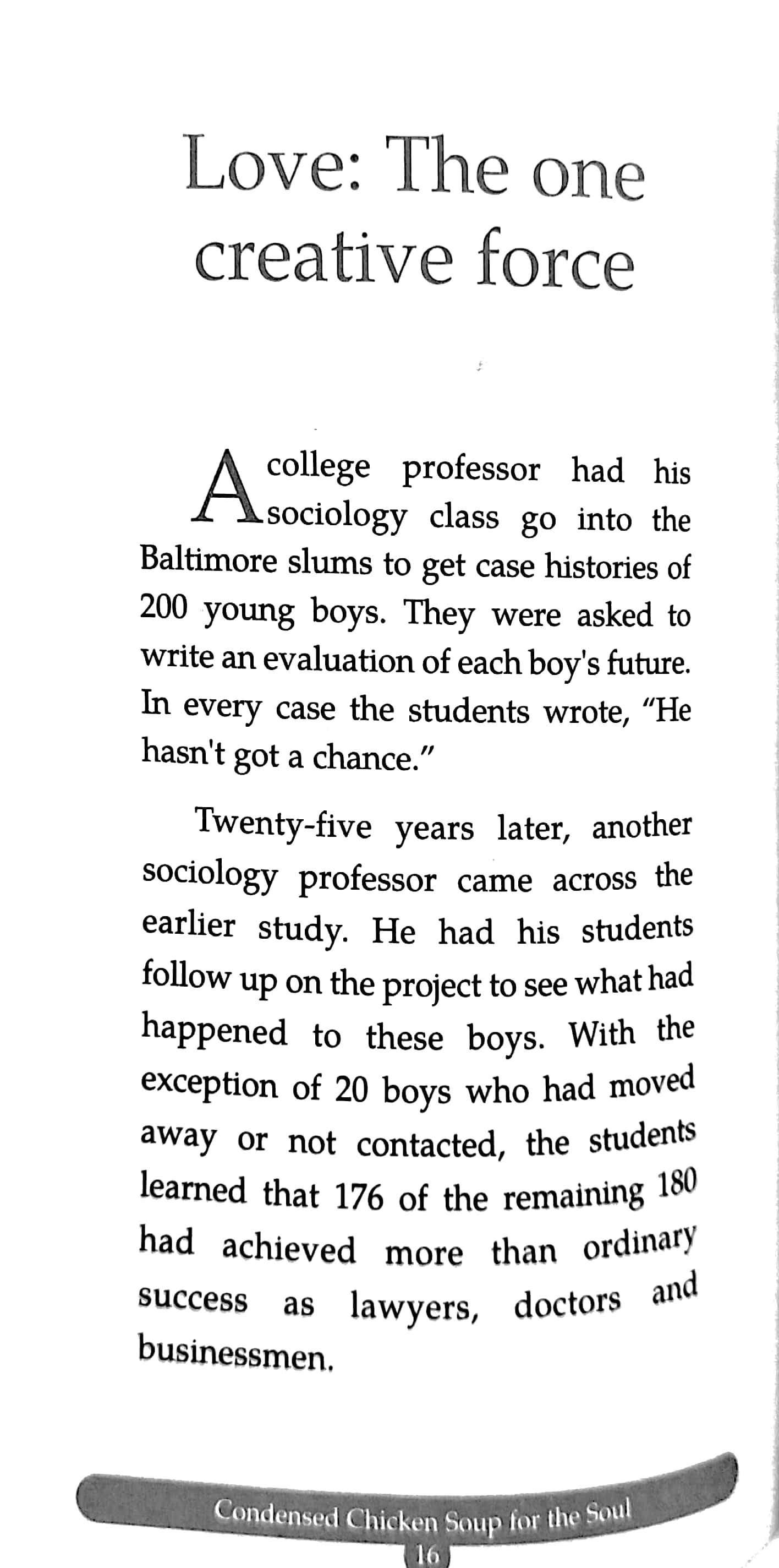 Đôi khi chỉ cần một câu chuyện để truyền cảm hứng cho một ngày mới; thay đổi một hướng đi; chữa lành tổn thương của một trái tim; sống dậy một tâm hồn; nuôi dưỡng một ước mơ; và có thể cứu được một cuộc đời, Chicken Soup for the Soul đã trở thành một thương hiệu lớn có giá trị không chỉ về mặt thương mại mà còn ở tính nhân văn cao đẹp. Những câu chuyện về tình yêu thương, về sự quan tâm của cha mẹ, về sự trải nghiệm khám phá và học hỏi trong bộ sách này sẽ khơi dậy khát vọng trong bạn, thôi thúc bạn dang rộng cánh tay chia sẻ đầy yêu thương với bạn bè và người thân, sẽ là niềm an ủi, xoa dịu những khi bạn căng thẳng tinh thần, sẽ làm bạn bừng sáng với những thời khắc của sự vượt lên chính mình và thức tỉnh cảm nhận. Chúng sẽ khuyến khích bạn kiên trì nuôi dưỡng, dám sống với ước mơ, sẵn sàng vượt qua những khó khăn, thử thách mà bạn chắc chắn sẽ gặp phải trên cuộc hành trình biến ước mơ thành hiện thực.