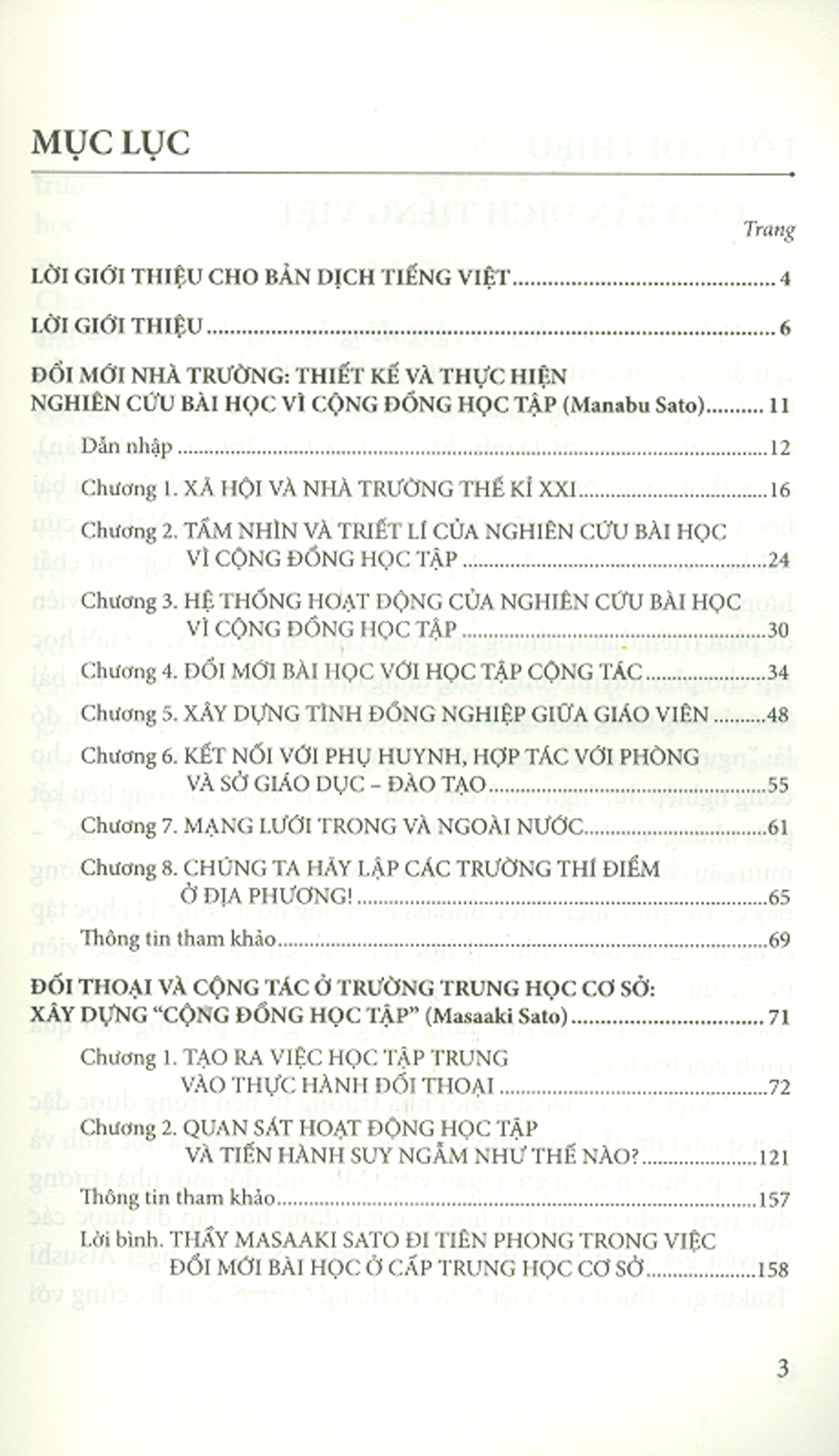 Cuốn sách này là sự kết hợp từ một cuốn sách của Giáo sư Manabu Sato và hai chương sách của thầy Masaaki Sato. Cuốn sách đầu tiên “Đổi mới nhà trường: Thiết kế và thực hiện Nghiên cứu bài học vì cộng đồng học tập” của Giáo sư Sato mô tả chi tiết tầm nhìn, triết lí và hệ thống hoạt động của Nghiên cứu bài học vì cộng đồng học tập (NCBHCĐHT). Nó cung cấp nền tảng lí luận vững chắc cho NCBHCĐHT, giúp người đọc hiểu những ý tưởng đằng sau mô hình đổi mới nhà trường này. Cuốn sách thứ hai “Đối thoại và cộng tác ở trường trung học cơ sở: Xây dựng cộng đồng học tập” được viết bởi tác giả Masaaki Sato gồm có ba chương: Chương đầu tiên là một chương sách tuyệt vời nhưng chúng tôi không giới thiệu ở bản dịch tiếng Việt vì nó trùng lặp với cuốn sách của Giáo sư Sato; Hai chương tiếp theo để cập đến kĩ năng thực hiện NCBHCĐHT, tập trung vào chủ đề đối thoại và cộng tác với những ví dụ phân tích cụ thể từ các bài học mà tác giả trực tiếp tham dự khi cố vấn cho các trường học ở Nhật Bản xây dựng mộ hình NCBHCĐHT. Mặc dù những ví dụ được đưa ra trong bối cảnh nhà trường trung học cơ sở (THCS), chúng vẫn còn nguyên giá trị đối với các cấp học khác.
