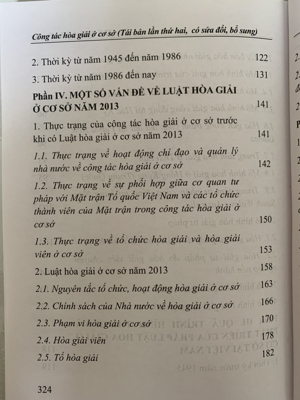 Cuốn “Công tác hòa giải ở cơ sở” (Tái bản lần thứ hai, có sửa đổi, bổ sung) là kết quả nghiên cứu, sưu tầm, tổng hợp và hệ thống một số khái niệm, mô hình hòa giải của các nước trên thế giới; quá trình hình thành và phát triển của chế định hòa giải ở Việt Nam qua các thời kì … Cuốn sách là tài liệu tham khảo phục vụ cho công tác tra cứu, tìm hiểu và tuyên truyền, phổ biến Luật hòa giải ở cơ sở.