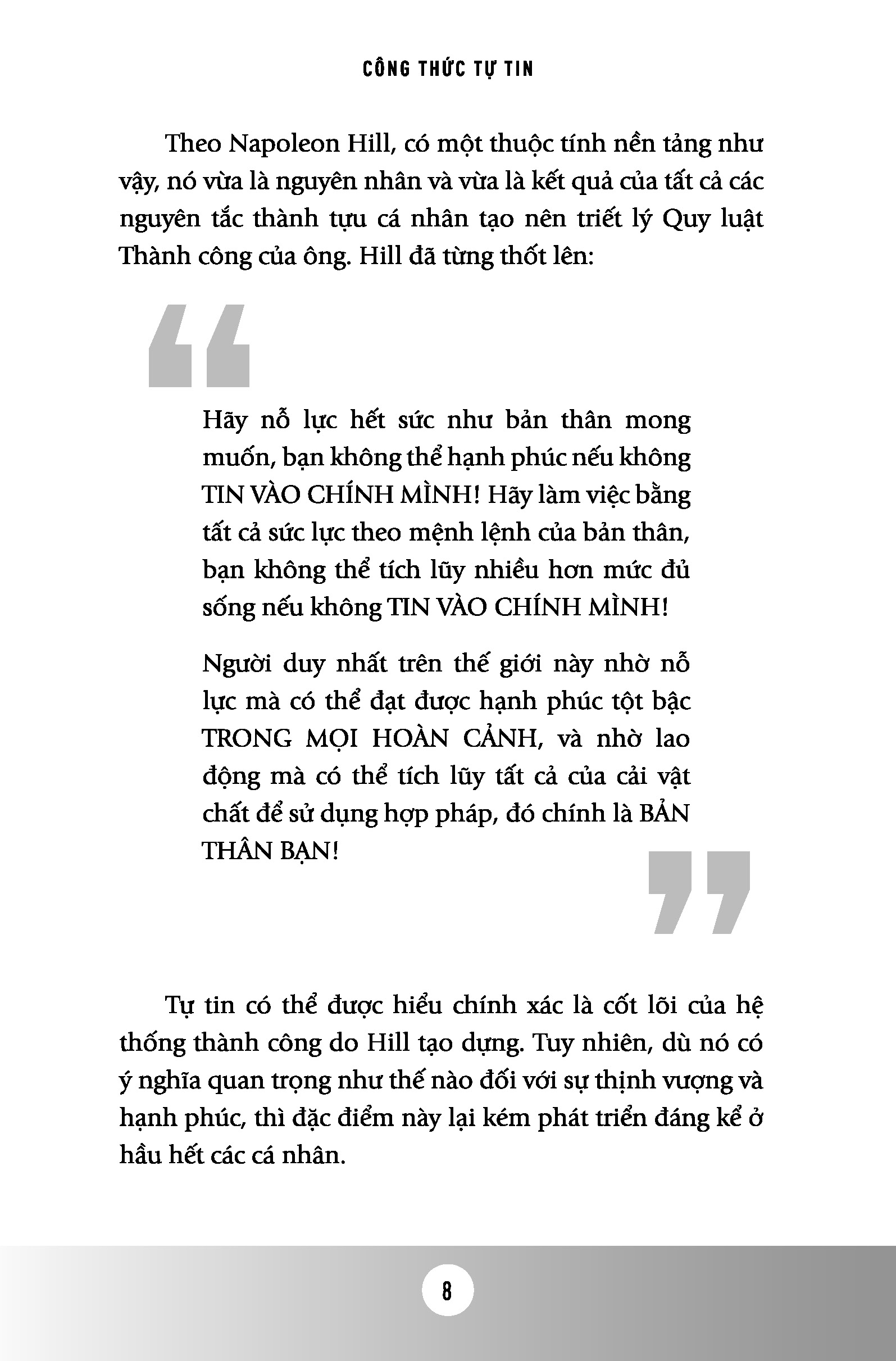 Thiếu tự tin là một trong những căn bệnh phổ biến nhất của thế giới ngày nay, gây ra sự bất lực tràn lan, thiếu tự chủ, thiếu mục đích, trì trệ và tuyệt vọng đặc trưng của xã hội hiện đại. Nhưng như ông trùm ngành thép Andrew Carnegie đã nhấn mạnh với Napoleon Hill: “Tự tin là một trạng thái tâm trí, là yếu tố cần thiết để thành công, và điểm khởi đầu của việc phát triển lòng tự tin và sự rõ ràng về mục đích.”