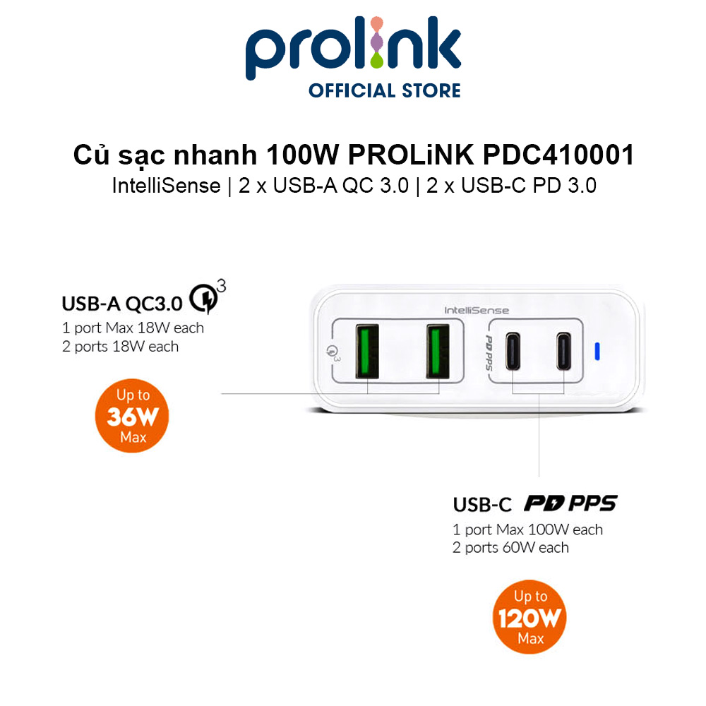 Củ sạc nhanh 100W PROLiNK PDC410001, 4 cổng (2xUSB-A QC 3.0 & 2xUSB-C PD 3.0) IntelliSense, sạc điện thoại, laptop