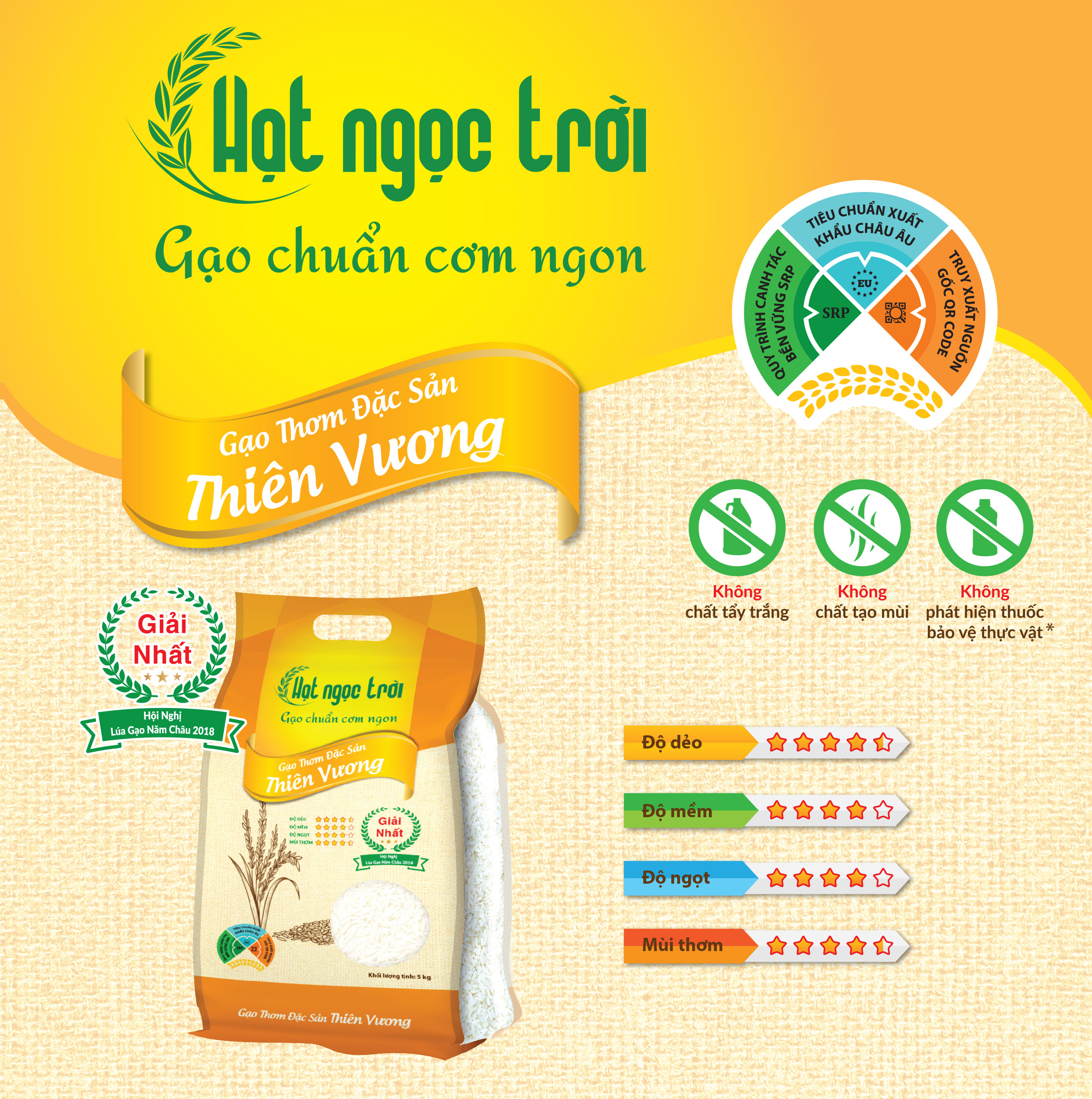 Gạo thơm đặc sản THIÊN VƯƠNG – GẠO NGON NHẤT tại Hội Nghị Lúa Gạo Năm Châu 2018 Gạo thơm đặc sản Thiên Vương có hạt thon dài mảnh mai, cơm có vị đậm, ngọt của gạo và độ mềm, dẻo, không dính hòa quyện với sự kết tinh tinh tế giữa hương lài và hương lá dứa (lá nếp) của hai giống gạo lừng danh Lộc Trời 28 và Basmati. Hạt lúa giống gạo thơm Lộc Trời 28 Gạo thơm đặc sản Thiên Vương được trồng trên vùng nguyên liệu theo tiêu chí lúa gạo bền vững quốc tế SRP đầu tiên tại Việt Nam, dưới sự giám sát của lực lượng kỹ sư nông nghiệp Ba Cùng. Đạt tiêu chuẩn BRC – tiêu chuẩn an toàn thực phẩm của Châu Âu và các tiêu chuẩn quốc tế khác.