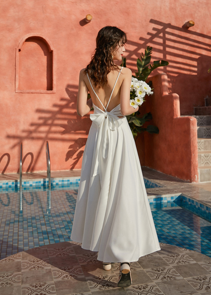 - Dạo bước trên bãi biển với chiếc váy lụa trơn, suông, trần lưng với điểm nhấn là chiếc nơ cực kì điệu đà.