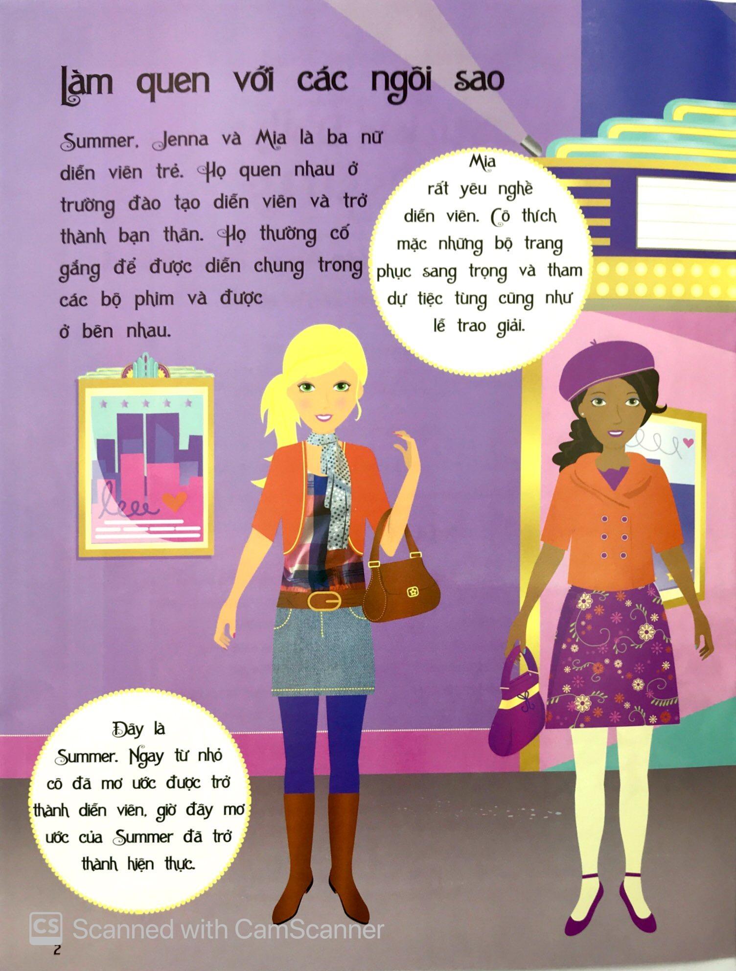 Mia, Summer và Jenna là ba nữ diễn viên trẻ rất thích diễn xuất trước máy quay và hóa thân thành các nhân vật trong nhiều bộ phim. Em hãy dùng những miếng dán trong sách để giúp họ chuẩn bị trang phục cho những dịp như chụp hình, thử vai, đóng phim hành động, hay tham dự lễ trao giải và nhiều hoạt động thú vị khác nhé!