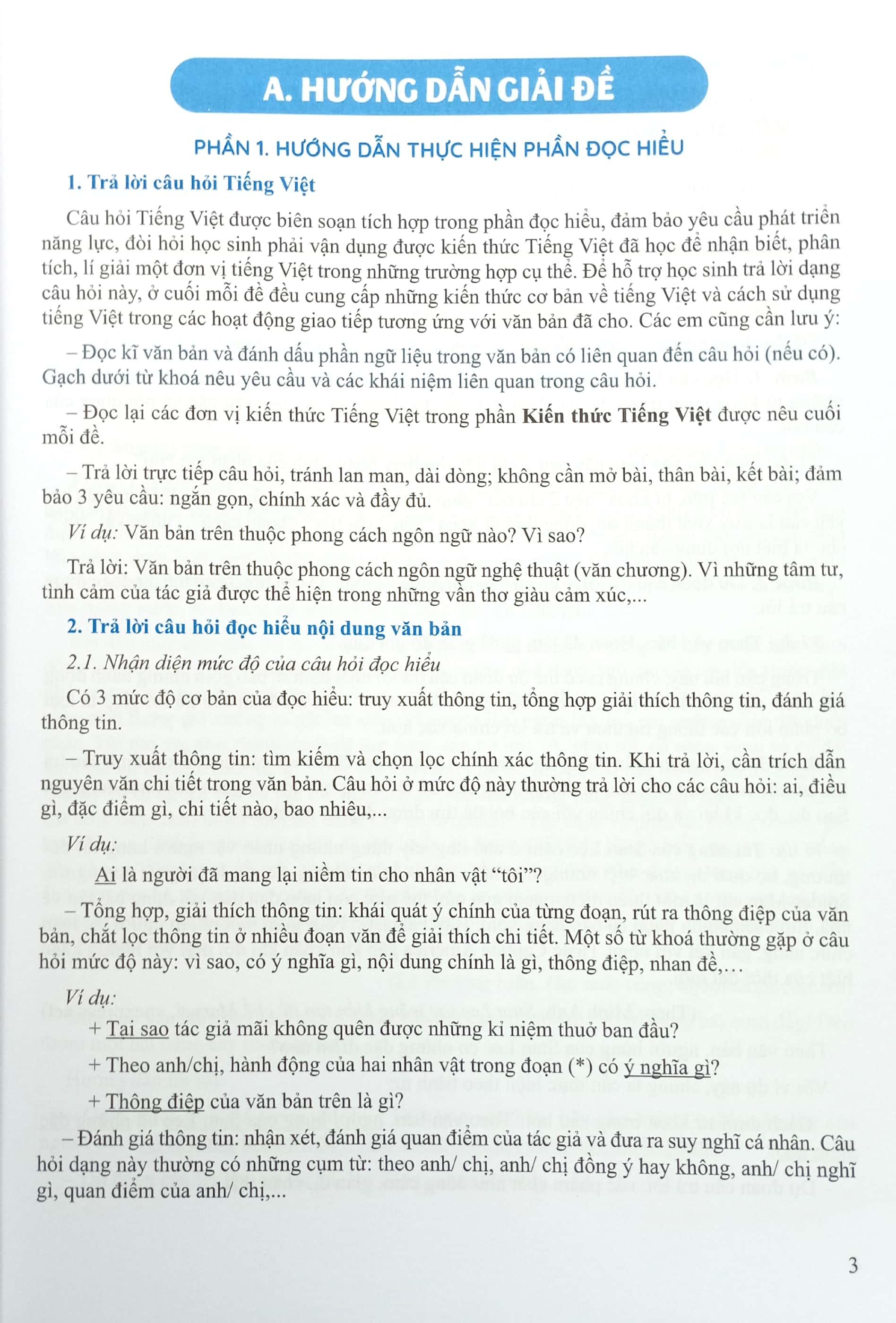– Có phần Hướng dẫn giải đề ở phần đầu sách, cung cấp chi tiết cách thức thực hiện phần Đọc hiểu, phần Làm văn, có câu hỏi minh hoạ và hướng dẫn cách làm cho từng câu, đồng thời chỉ ra một số lỗi sai thường gặp khi làm bài và cách khắc phục chúng.