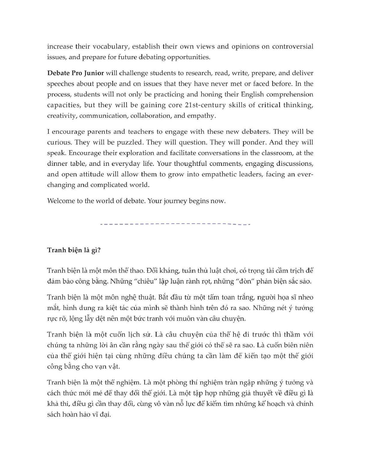 Là nguồn tài liệu bài bản đầu tiên dành cho việc dạy và học kỹ năng tranh biện ở bậc sơ cấp tại Việt Nam. Bộ sách được cô Hyewon Rho, chuyên gia giáo dục tranh biện, HLV trưởng tuyển tranh biện Việt Nam dự cúp Tranh biện thế giới đánh giá và viết lời giới thiệu