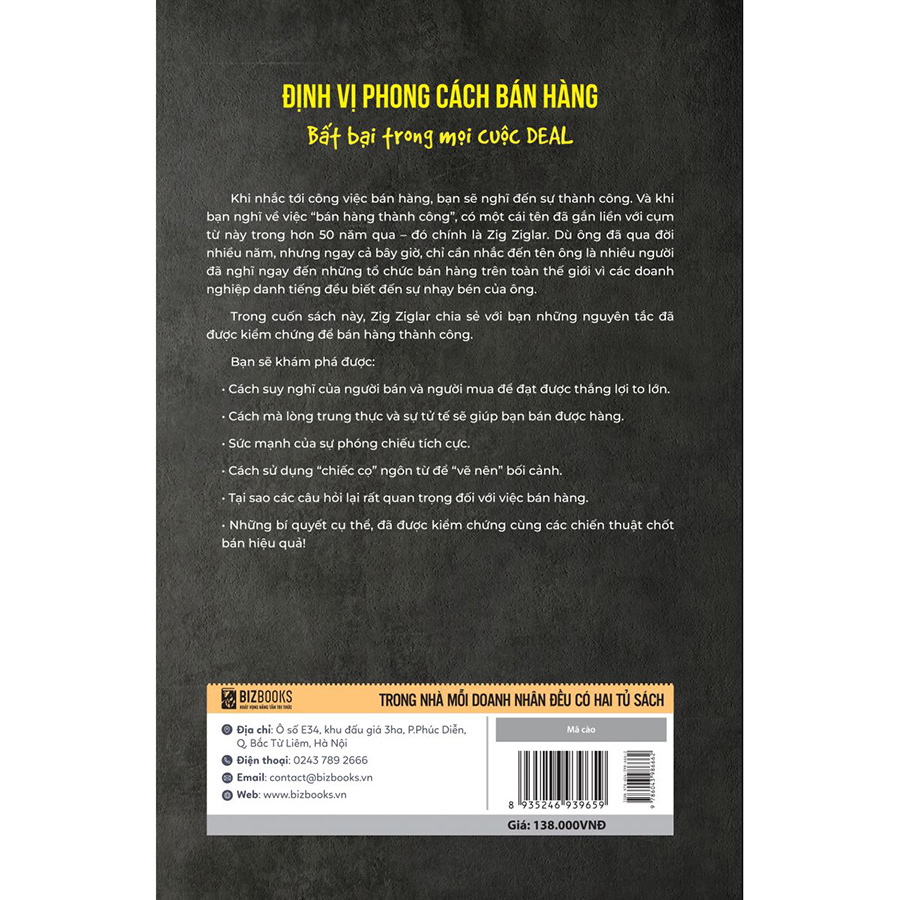 Với những nhà bán hàng xuất sắc nhất thế giới, việc bán hàng không đồng nghĩa với quảng bá sản phẩm. Bán hàng, với họ, là hành trình quảng bá bản thân - tuyên bố với thế giới rằng: tôi là người bán hàng chuyên nghiệp, chính trực và thành tâm mong muốn trao đi những giá trị hữu hình. Trong cuốn sách này, Zig chia sẻ với bạn những nguyên tắc đã được kiểm chứng để bán hàng thành công. Những chiến lược đơn giản nhưng đã được chứng minh là thành công và hiệu quả này sẽ giúp tất cả các thương vụ của bạn sinh lời nhiều hơn. Những đề xuất thực tế của ông có thể áp dụng ngay lập tức để nâng cao trường năng suất của bạn - và giúp bạn trở thành một chuyên gia bán hàng hàng đầu.