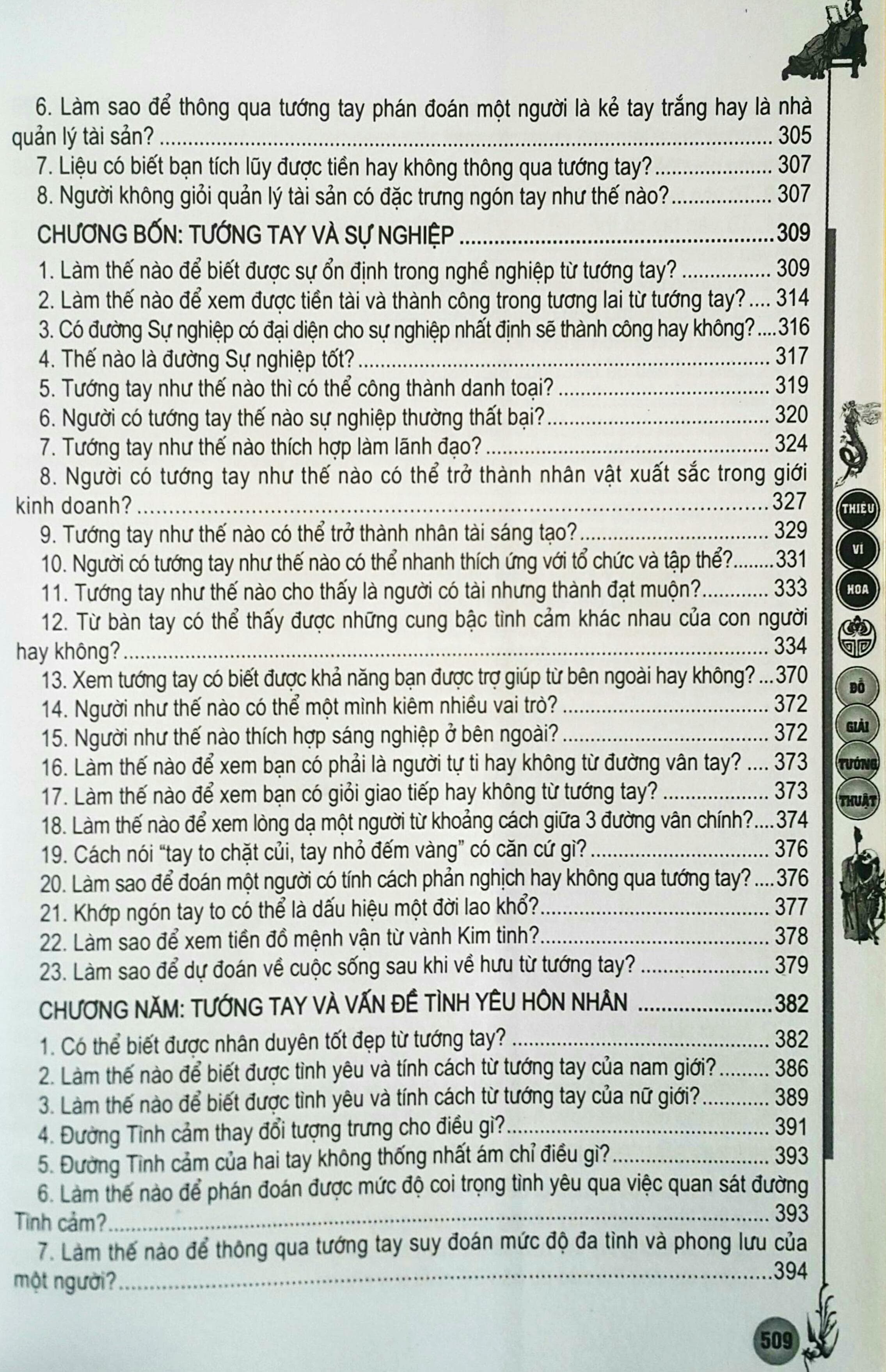 Phần thứ ba là tri thức về tướng tay, quan sát hình dạng bàn tay, vân tay để phán đoán về tài vận, sự nghiệp, tình yêu và hôn nhân. Đặc biệt trong phần này còn giới thiệu tướng tay của những người nổi tiếng như Lưu Bị, Công Tôn Thuật, Obama, Diana, E để bạn đọc cảm nhận sâu sắc lý do vì sao họ nổi tiếng, được cả thế giới ca ngợi, tôn sùng.
