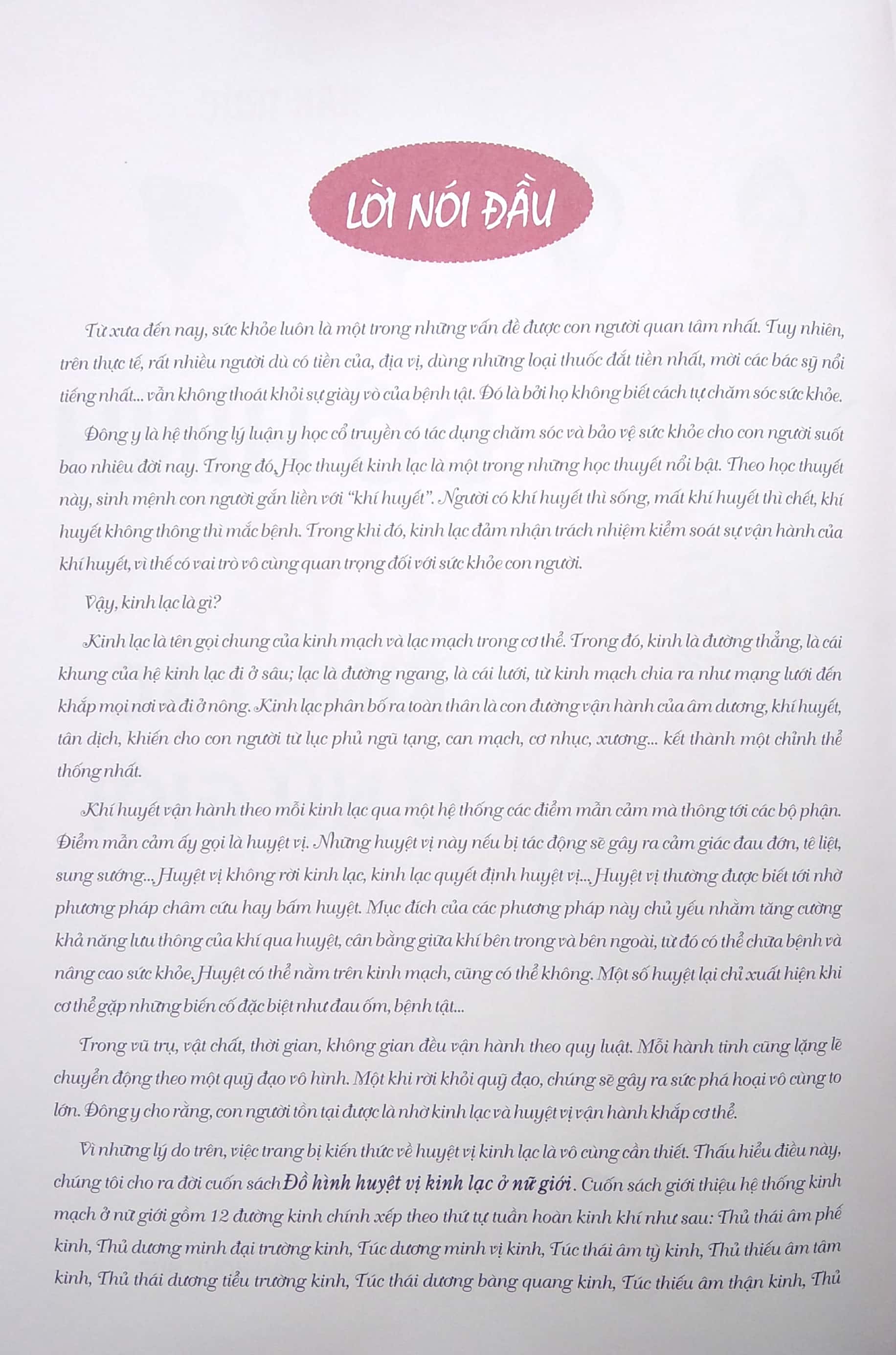 Cuốn sách giới thiệu hệ thống kinh mạch ở nữ giới gồm 12 đường kinh chính xếp theo thứ tự tuần hoàn kinh khí như sau: Thủ thái âm phế kinh, Thủ dương minh đại trường kinh, Túc dương minh vị kinh, Túc thái âm tỳ kinh, Thủ thiếu âm tâm kinh, Thủ thái dương tiểu trường kinh, Túc thái dương bàng quang kinh, Túc thiếu âm thận kinh, Thủ quyết âm tâm bào kinh, Thủ thiếu dương tam tiêu kinh, Túc thiếu dương đảm kinh, Túc quyết âm can kinh; hệ thống lạc mạch bao gồm: Đốc mạch, Nhâm mạch.