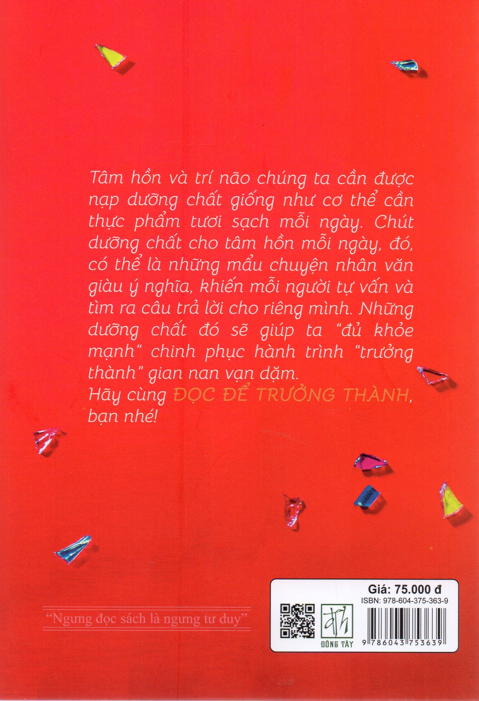 Sách Đọc để trưởng thành - Trái tim đẹp nhất Nhà xuất bản Phụ Nữ Nhà phát hành : Công Ty TNHH Văn Hóa Đông Tây Năm xuất bản : 2024 Tác Giả : Nguyễn Ngoan và Hà Thùy Dung tuyển dịch Số trang : 199 Khổ 13.5 x 20cm Trọng lượng : 500gr ISBN : 9786043753639 Tâm hồn và trí não của chúng ta cần được nạp dưỡng chất giống như cơ thể cần thực phẩm tươi sạch mỗi ngày. Chút dưỡng chất cho tâm hồn mỗi ngày, đó có thể là những mẩu chuyện nhân văn giàu ý nghĩa, khiến mỗi người tự vấn và tìm ra câu trả lời cho riêng mình. Những dưỡng chất đó sẽ giúp ta "đủ khỏe mạnh" chinh phục hành trình "trưởng thành" gian nan vạn dặm. Hãy cùng Đọc để trưởng thành bạn nhé!
