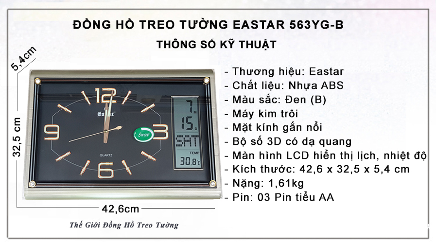 1. ĐẶC ĐIỂM NỔI BẬT: - Đồng Hồ Treo Tường Cao Cấp EASTAR Kim điện tử, Dạ quang, Đồng hồ Lịch Vạn Niên và Nhiệt kế hình Chữ nhật, Mặt kính Nổi, hiện đại, sang