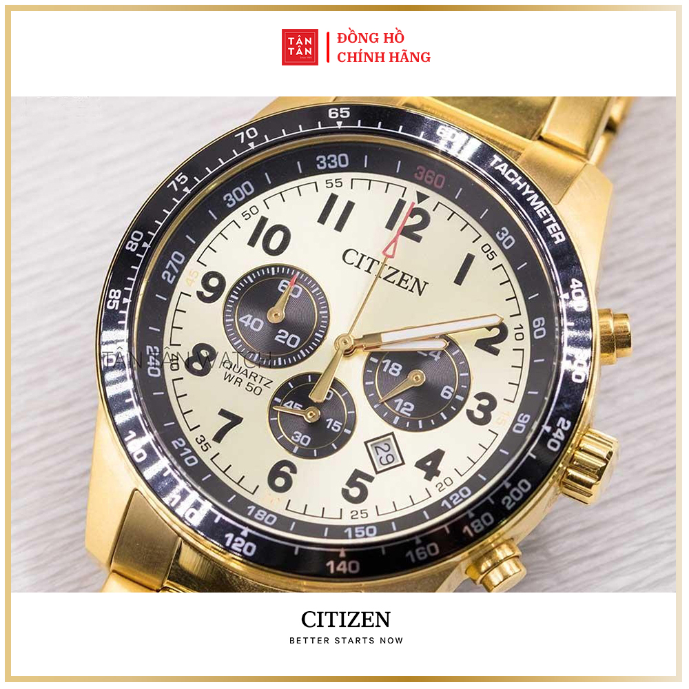 ● Thương hiệu: Citizen ● Mã sản phẩm: AN8162-57P ● Xuất xứ: Nhật Bản ● Giới tính: Nam ● Loại máy đồng hồ: Quartz ● Chất liệu mặt kính: Kính khoáng ● Bảo hành quốc tế: 1 năm ● Bảo hành Tân Tân: 5 năm (đã bao gồm Bảo hành quốc tế) ● Đường kính vỏ: 44mm ● Độ dày vỏ: 12mm ● Chất liệu vỏ: Thép không gỉ ● Chất liệu dây: Thép không gỉ ● Màu dây: Vàng ● Màu mặt số: Vàng ● Loại kim: Pencil ● Chống nước: WR50 ● Chức năng: Chronograph, Lịch ngày, Giờ 24, Dạ quang, Thước đo tốc độ Tachymeter ● Nơi lắp ráp: Nhật - Trung Quốc - Thái Lan (Tùy lô) ● Phong cách: Thể thao