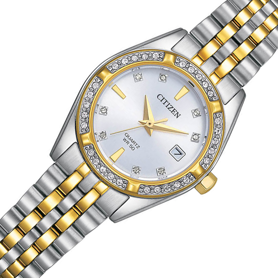 Đồng hồ QC07J204Y với thiết kế mặt đính đá xung quanh viền trong mặt đồng hồ làm nổi bật sự sang trọng và thời trang của sản phẩm Thông số kỹ thuật: - Dây :