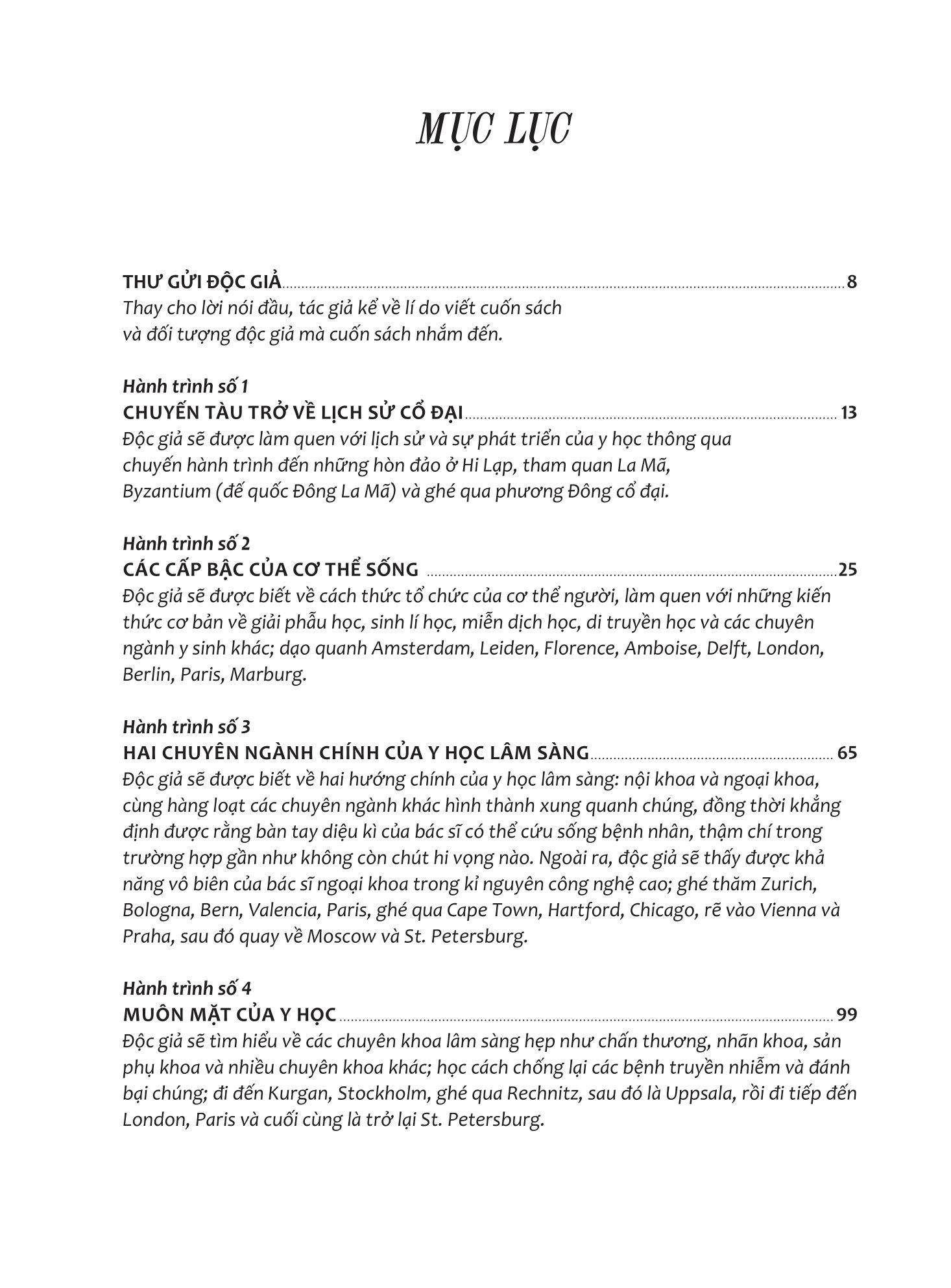 Công việc của các bác sĩ và nhà khoa học y khoa trải rộng trên những lĩnh vực nào? Những bạn trẻ đang ôm giấc mộng trở thành bác sĩ phải đối mặt với những thử thách nào trong quá trình học tập và hành nghề? Chúng ta có thể tìm thấy những chỉ dẫn về thế giới y học ở đâu, và liệu việc lựa chọn học y có phù hợp với m.ình hay không? Từ những nỗi trăn trở đó, kết hợp với kinh nghiệm thực tiễn, hai tác giả Mikhail Alexandrovich Paltsev và Igor Moiseevich Kvetnoy đã biên soạn Du Hành Vào Thế Giới Y Học Tự Cổ Chí Kim, dành cho các bạn trẻ có ước mơ trở thành bác sĩ, những người cống hiến hết m.ình cho công việc khó khăn vì sức khỏe nhân loại.