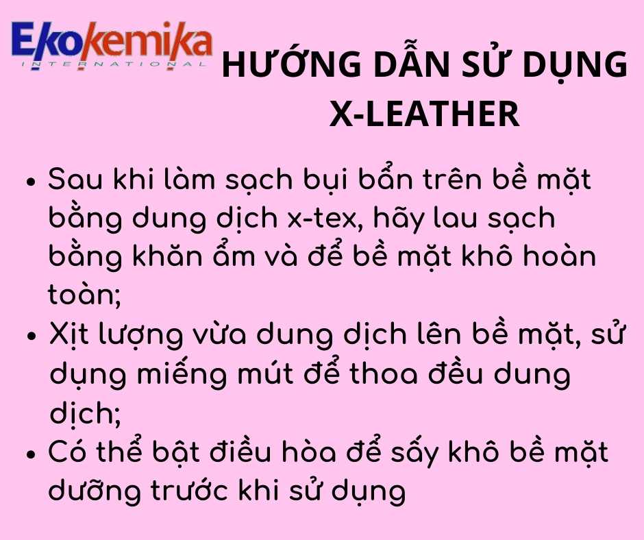 Sử dụng sau khi loại bỏ vết bẩn, dầu mỡ và các tạp chất bám trên bề mặt nội thất, xịt một lượng nhỏ dung dịch X-Leather lên toàn bộ nội thất để tạo ra một lớp bảo vệ, giúp chống lại tác động của ánh nắng mặt trời và các yếu tố khác từ môi trường bên ngoài và giúp nội thất luôn sáng đẹp như mới, hạn chế bám bụi.