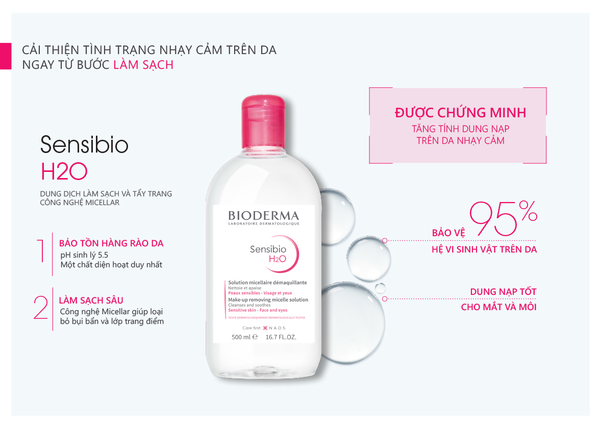 - Nước tẩy trang Bioderma Sensibio H2O là dung dịch làm sạch và tẩy trang dạng hạt mixen (micelle) dành cho vùng mặt và mắt, dành cho da nhạy cảm. - Công dụng: Nước tẩy