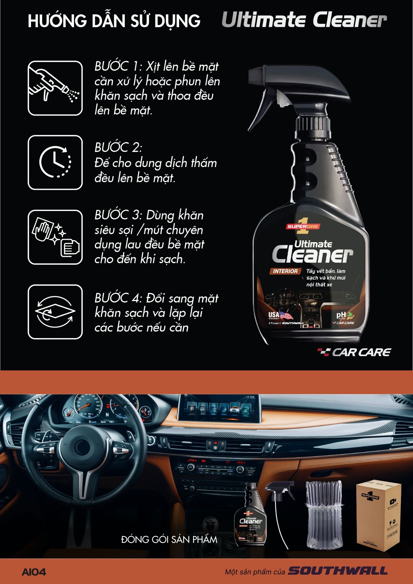 Dung Dịch Tẩy Vết Bẩn Và Làm Sạch Nội Thất Super One Ultimate Cleaner – Interior là sản phẩm chăm sóc ô tô chuyên dụng, giúp loại bỏ vết bẩn và làm sạch nội thất xe một cách hiệu quả. Sản phẩm có thể sử dụng trên các chất liệu khác nhau như nỉ, da, vải, gỗ, cao su, nhựa, kim loại…Dung dịch có khả năng tẩy sạch các loại vết bẩn cứng đầu như vết dầu mỡ, vết ố, vết cà phê, vết trà, vết thức ăn, vết ố nhựa, vết ố cao su, vết ố kim loại,… một cách nhanh chóng và dễ dàng. Sản phẩm cũng giúp loại bỏ mùi khó chịu, lưu hương thơm mát cho nội thất xe. Dung dịch tẩy rửa nội thất Super One Ultimate Cleaner – Interior an toàn cho các chất liệu nội thất, không làm phai màu, xuống cấp, bong tróc hay hư hỏng. Sản phẩm cũng không để lại lớp nhờn trên bề mặt nội thất và da tay.