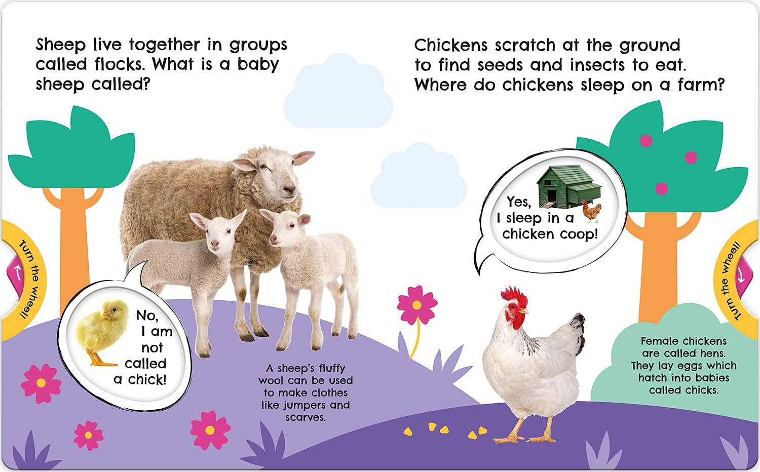Discover first farm animal facts with this fun and interactive turn-the-wheel book. Learn about different farm animals and farm machines by moving and turning the wheels in this fun non-fiction book. First facts are presented through simple questions for the reader to solve by turning a card wheel to discover the correct answers.