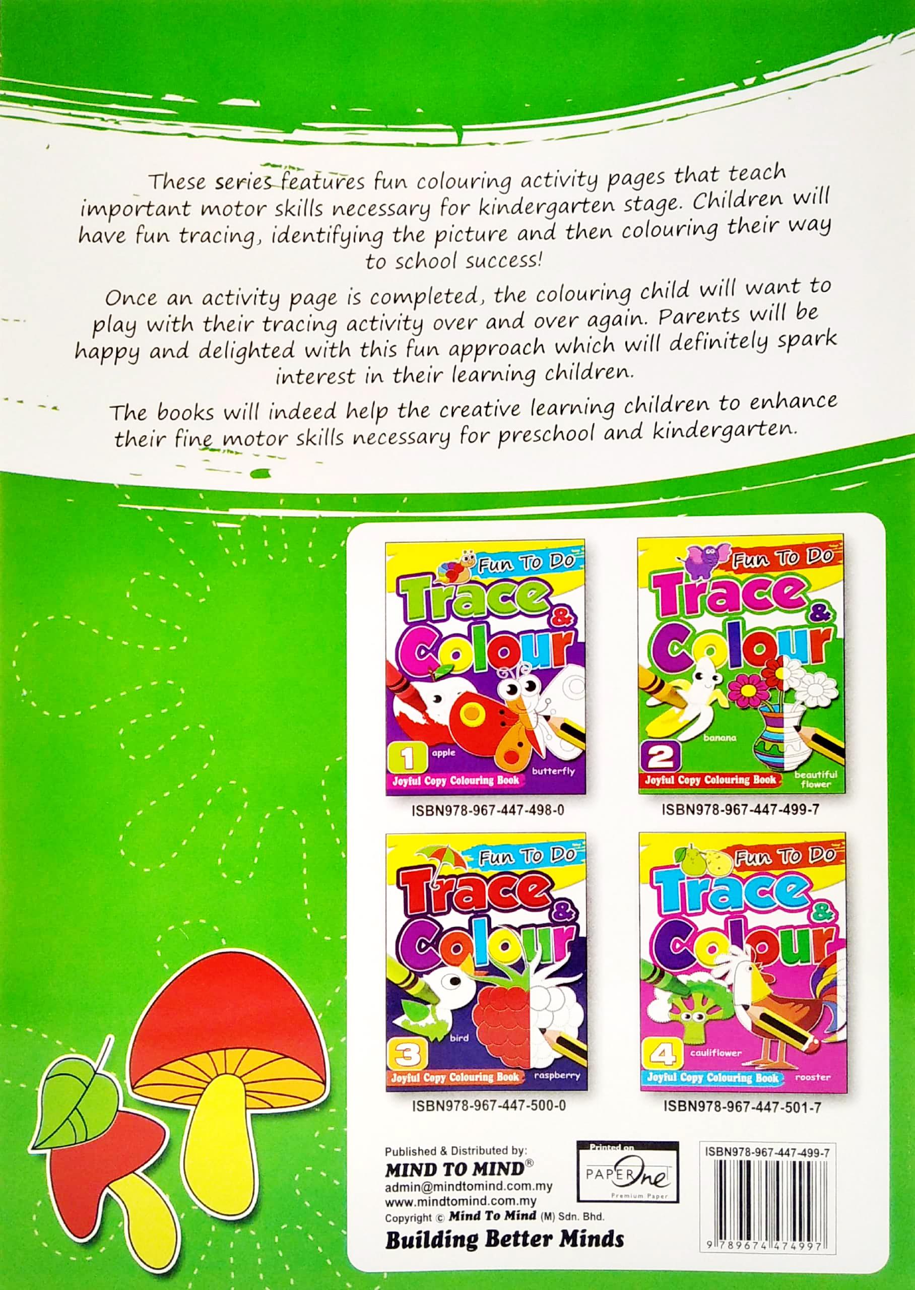 This fun loving and colourful activity book series with beautiful attractive illustrations features the multiple engaging and mind stimulating activities which develop fine motor skills, learn tracing and effective colouring ability, promote writing, reading and listening skills, build hand and eye coordination, and provide other developmental benefits. This tracing and colouring will further help to become familiar with lines, shapes, structures, forms and patterns, also learn about the various shades of colour and contrast.
