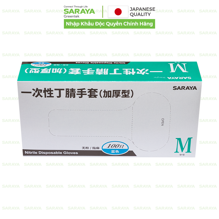 Thương hiệu: SARAYA. Xuất xứ thương hiệu: NHẬT BẢN. Xuất xứ: Trung Quốc. Quy cách đóng gói: 100 cái/ hộp, 10 hộp/ thùng. Đặc tính & công dụng sản phẩm: Dày, Không mùi, Không bột, Không chứa Latex. Hướng dẫn sử dụng: - Chế biến thực phẩm. - Công nghiệp điện tử. - Vệ sinh nhà cửa. - Spa và làm đẹp. - Vệ sinh y tế. - Vệ sinh công cộng - Dùng một lần, có thể sử dụng cho cả 2 tay (tay trái và tay phải). Hướng dẫn bảo quản: Nơi khô ráo, thoáng mát tránh ánh sáng mặt trời trực tiếp, ánh sáng đèn huỳnh quang, tia X, hơi ẩm hoặc ozone. Tránh bảo quản ở nhiệt độ trên 60 độ C.