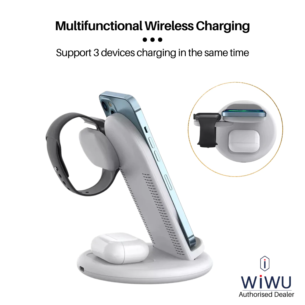 Giá đỡ từ tính kiếm đế sạc không dây Qi sạc nhanh 15W 3 in 1 hỗ trợ sạc dành cho Tai nghe / Appe Watch / iPhone hiệu WIWU Power Air Wireless Charger PA3IN1B