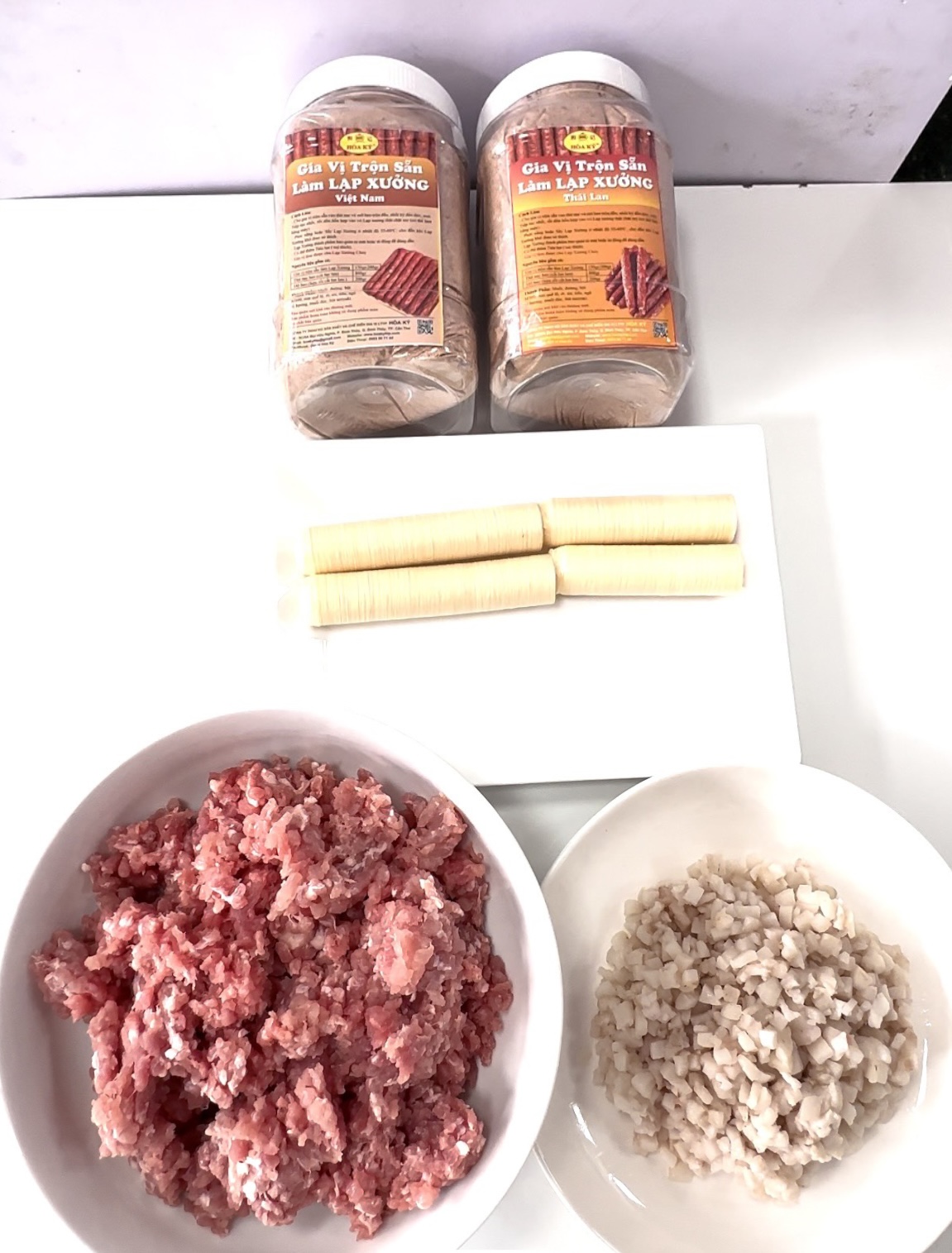 Nguyên liệu gồm có : - Gia vị trộn sẵn làm Lạp Xưởng: 150gr- 200gr. -Thịt nạc heo ( cắt hạt lựu ) 800gr -Mỡ heo (luộc rồi cắt hạt lựu )200gr Tiêu ( tuỳ thích)