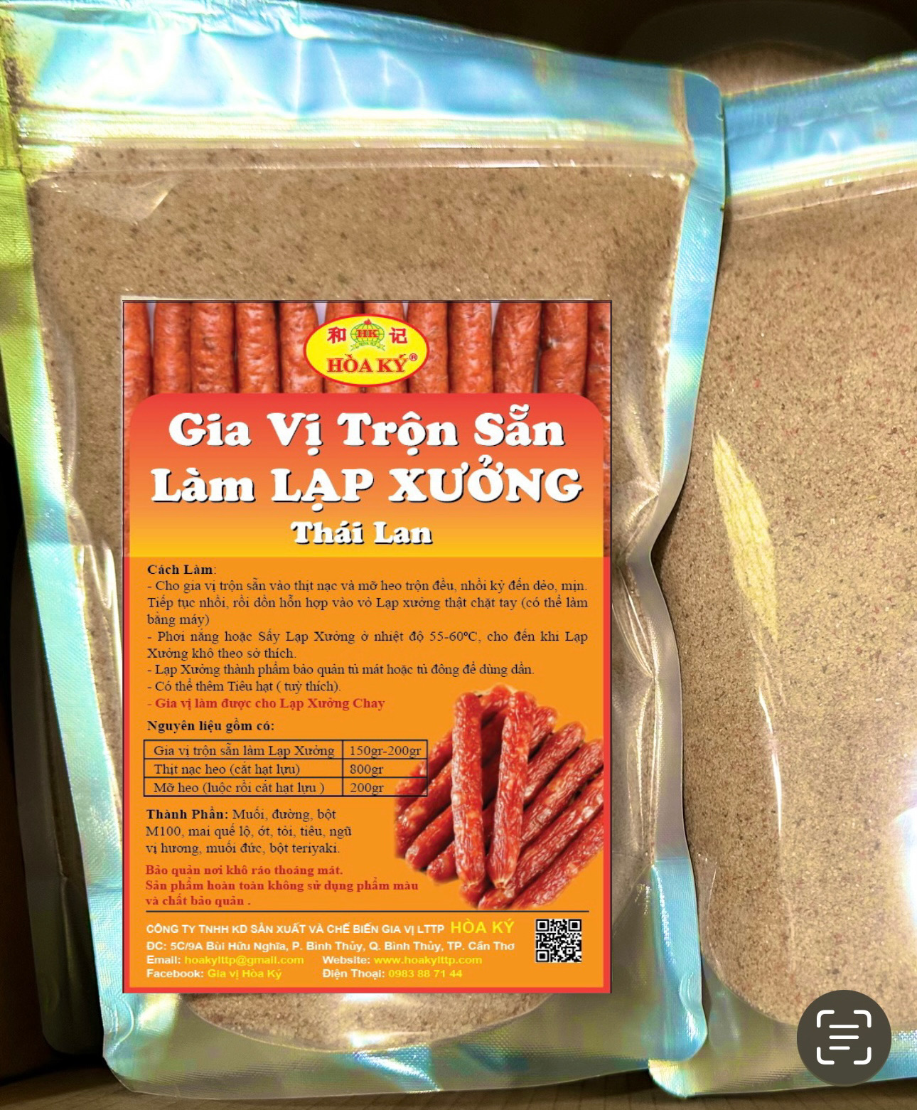 - Gia vị trộn sẵn làm Lạp Xưởng: 150gr- 200gr. -Thịt nạc heo ( cắt hạt lựu ) 800gr -Mỡ heo (luộc rồi cắt hạt lựu )200gr Tiêu ( tuỳ thích) Cách Làm: -Cho gia vị trộn sẵn vào thịt nạc và mỡ heo trộn đều, nhồi kỷ đến dẻo, mịn. Tiếp tục nhồi, rồi dồn hỗn hợp vào vỏ Lạp xưởng thật chặt tay ( có thể làm bằng máy ). -Phơi nắng hoặc Sấy Lạp Xưởng ở nhiệt độ 55-60*c ,cho đến khi Lạp Xưởng khô theo sở thích. -Lạp Xửơng thành phẩm bảo quản tủ mát hoặc tủ đông để dùng dần. Gia Vị làm được cho Lạp Xưởng Chay . Bảo quản nơi khô ráo thoáng mát. Sản phẩm hoàn toàn không sử dụng phẩm màu và chất bảo quản .