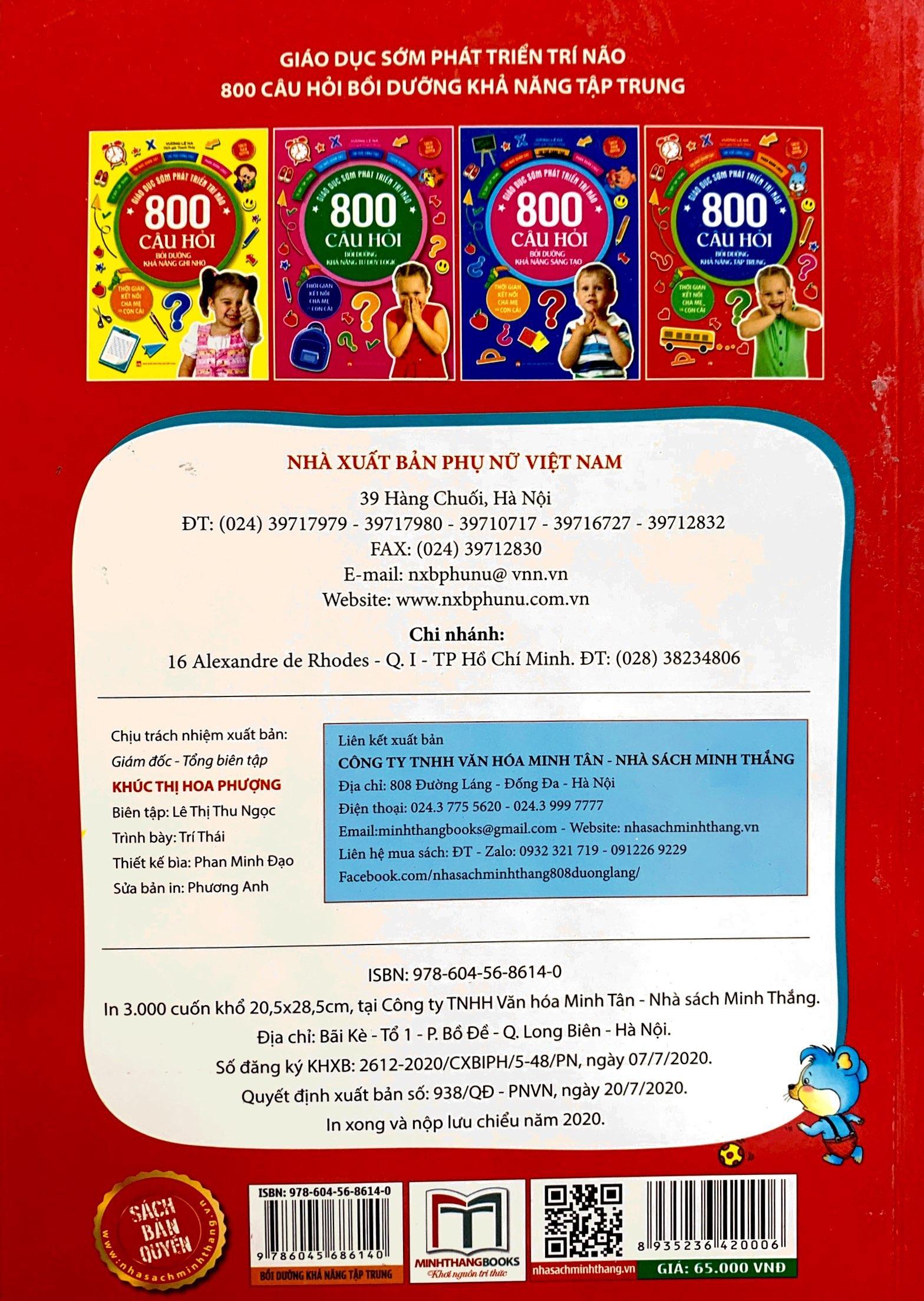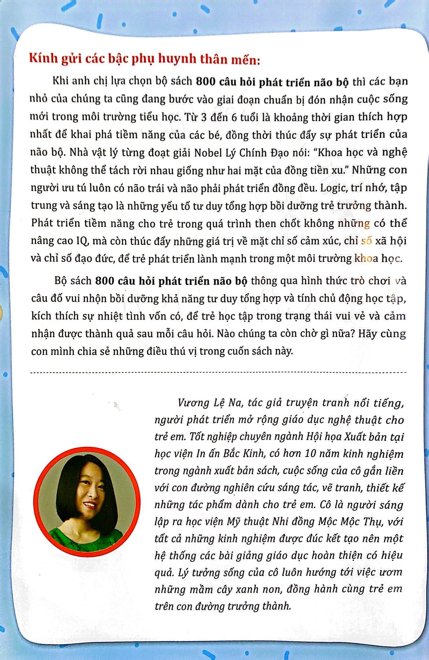 Bộ sách 800 câu hỏi phát triển não bộ thông qua hình thức trò chơi và câu đố vui nhộn bồi dưỡng khả năng tư duy tổng hợp và tính chủ động học tập , kiasch thích sự nhiệt tình vốn có , để trẻ học tập trong trạng thái vui vẻ và cảm nhận được thành quả sau mỗi câu hỏi . Nào chúng ta còn chờ gì nữa ? Hãy cùng con mình chia sẻ những điều thú vị trong cuốn sách này .