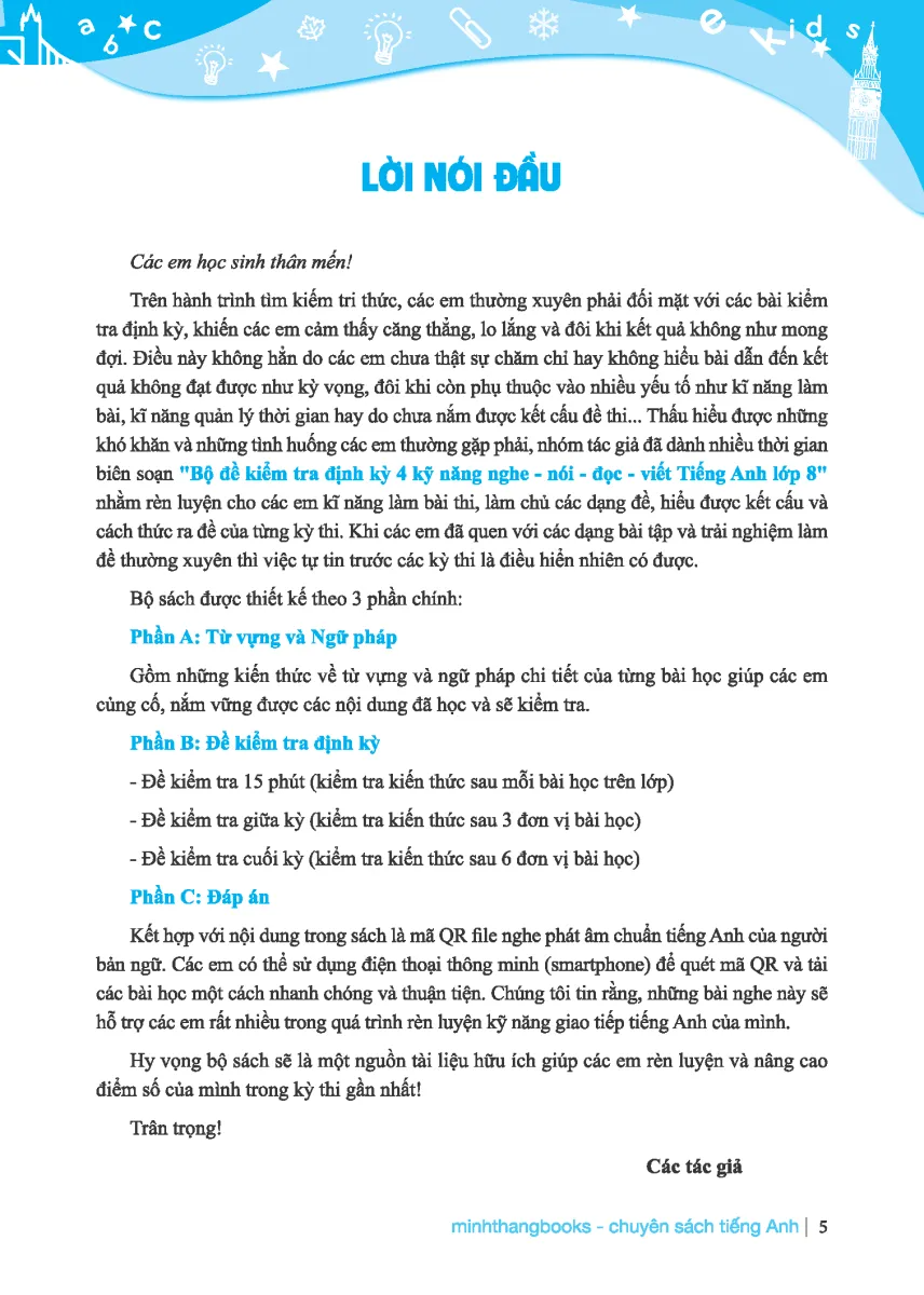 "Bộ đề kiểm tra định kỳ 4 kỹ năng nghe - nói - đọc - viết Tiếng Anh lớp 8" nhằm rèn luyện cho các em kĩ năng làm bài thi, làm chủ các dạng đề, hiểu được kết cấu và cách thức ra đề của từng kỳ thi. Khi các em đã quen với các dạng bài tập và trải nghiệm làm đề thường xuyên thì việc tự tin trước các kỳ thi là điều hiển nhiên có được.