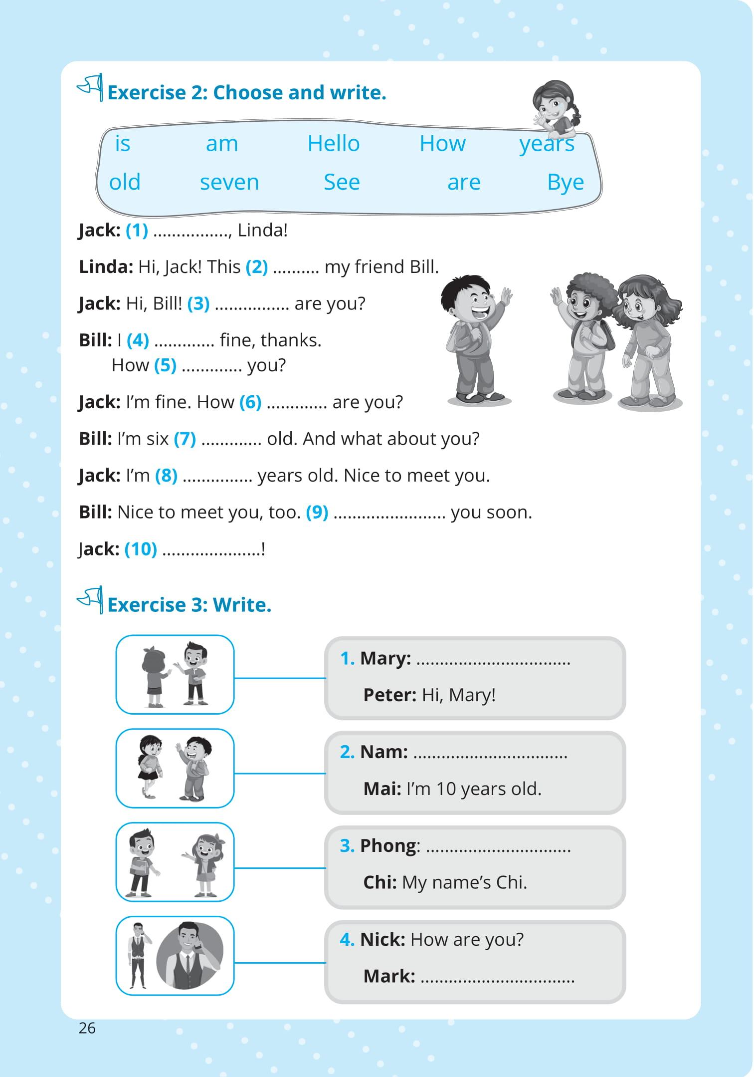 - “Học đi đôi với hành” – Bài tập thực hành đa dạng Để giúp các con hiểu sâu – nhớ lâu kiến thức và áp dụng được vào thực tế, các dạng bài tập thực hành rất phong phú: Bài tập nối (Match), điền từ vào chỗ trống, sửa lỗi sai, hoàn thành câu, dịch nghĩa…
