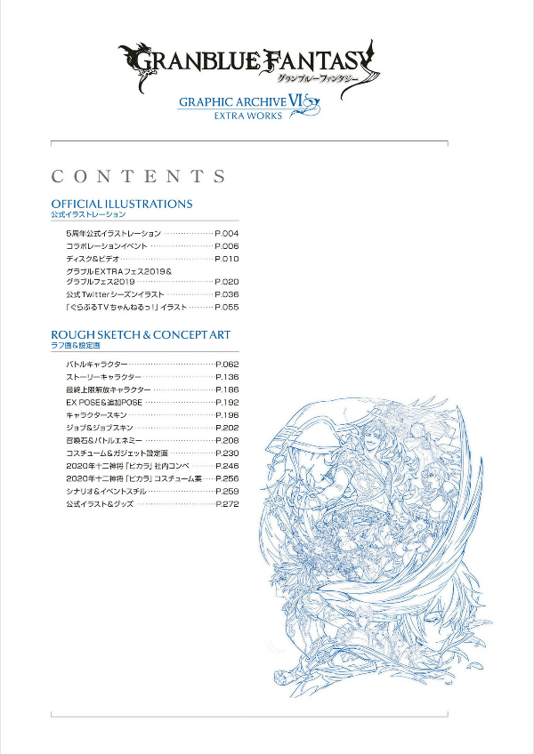 「グラブルフェス」をはじめとした各種公式イラスト、キャラクターやイベント&クエストなどの未公開ラフ画&設定画を史上最大のボリュームで収録。