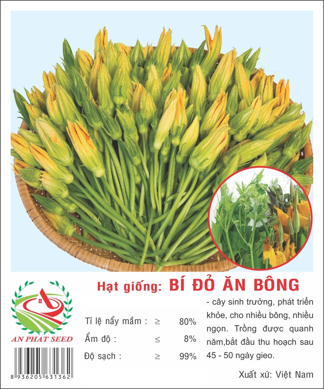 - Đặc tính giống: Bí ăn bông - Giống kháng bệnh tốt, giống sinh trưởng và phát triển mạnh. Mỗi dây cho 40-60 nụ hoa trái và bông, ăn ngon ngọt, có thể thu hoạch bông, nụ hoặc trái