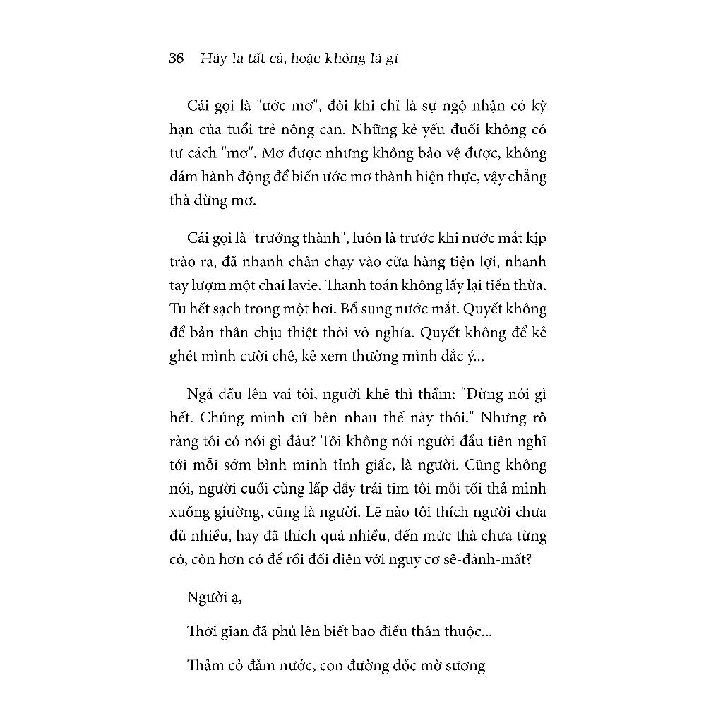 Nếu bạn đang có một ngày chênh vênh như thế, hãy để “HÃY LÀ TẤT CẢ, HOẶC KHÔNG LÀ GÌ” ở bên, tiếp thêm dũng khí để bạn đối diện với cuộc đời không bằng phẳng. Cầm cuốn sách trên tay, bạn sẽ hiểu: hành trình tuổi trẻ dù có chông gai đến đâu cũng không thể cản bạn đi tới tương lai rực rỡ.