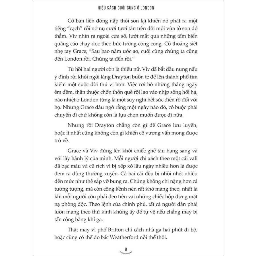 Hiệu sách cuối cùng ở London là cuốn tiểu thuyết tình cảm hấp dẫn, là những trang sử ghi lại quãng thời gian khó khăn của người dân London trong Chiến tranh Thế giới thứ Hai. Được truyền cảm hứng từ quá khứ có thật của số ít hiệu sách còn tồn tại sau cuộc oanh kích của Đức quốc xã, cuốn sách đã kể lại một câu chuyện về những mất mát của thời chiến, về tình yêu và sức mạnh của văn chương giúp con người ta vượt qua giai đoạn đen tối nhất.