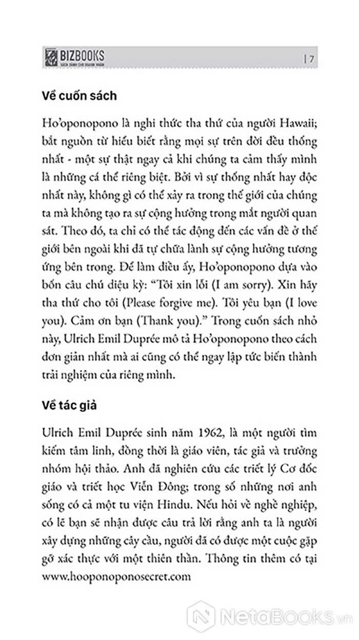 Ho’oponopono là một phương pháp thanh lọc tâm linh hồn giúp chúng ta gột sạch hết những nỗi sợ hãi và lo lắng, những khuôn mẫu quan hệ tàn hại, cũng như bất kỳ giáo điều và mô thức tôn giáo nào chống đối sự phát triển cá nhân và tâm linh của chúng ta. Nó làm sạch những tắc nghẽn trong suy nghĩ và cấu trúc tế bào của chúng ta, vì suy nghĩ của chúng ta được thể hiện trong cơ thể. Đây là sự thay đổi mô thức. Phương pháp này có nguồn gốc từ Hawaii và dựa trên hiểu biết rằng chúng ta đang sống trong một vũ trụ phong phú, và Thánh thần, muốn ta tận hưởng sự phong phú và hoàn hảo ấy. Tuy nhiên, thứ đang cản trở chúng ta trải nghiệm sự phong phú thực sự, cảm giác về sự thống nhất yêu thương, sự giàu có bên trong, sự phát triển tâm linh và sức khỏe hoàn hảo lại chính là chúng ta. Ho’oponopono thiên về thực hành và trong khi đọc cuốn sách nhỏ này, bạn đã có thể bắt đầu tháo gỡ nút thắt Gordian1 trong tim, sẵn sàng định hình lại thế giới tươi mới cho mình.