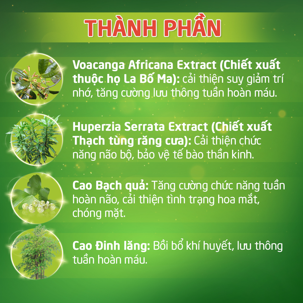 - Thành phần sản phẩm Trong mỗi viên có chứa: Cao bạch quả (Ginkgo biloba extract) 120mg GABA 50mg Cao đinh lăng 50mg Magie citrat 20mg Rutin 10mg Citicoline 5mg Voacanga Africana extract 5mg Coenzyme Q10 2mg Vitamin B6 2mg Melatonin 2mg Huperzia Serrate extract 400mcg (Chiết xuất thạch tùng răng cưa) Nattokinase 300FU Phụ liệu: Tinh bột, talc, magnesium stearate, gelatin, nipazil, nipazol vừa đủ 1 viên.
