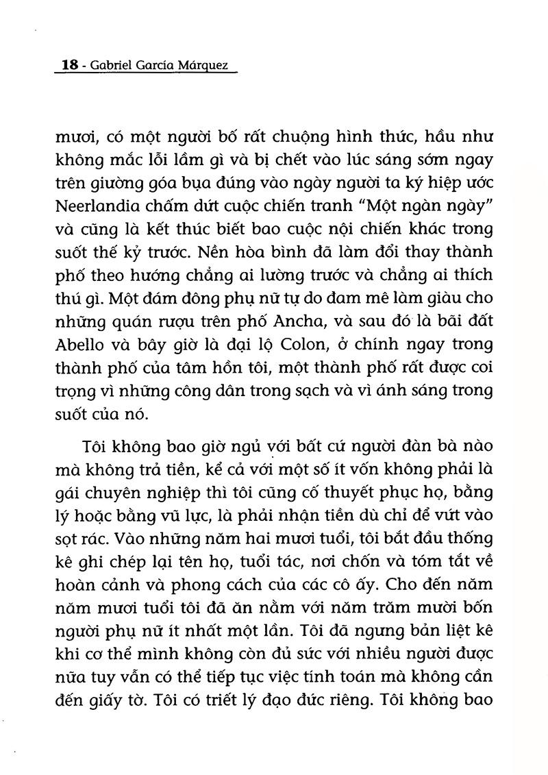 Cuốn sách mà tôi đang viết là cuốn sách về 'Cái cô đơn.” Quả thực, sau hơn 50 năm cầm bút, Márquez vẫn viết về cái cô đơn trong một câu chuyện khác, tác phẩm “Hồi ức về những cô gái điếm buồn của tôi”. Hồi Ức Về Những Cô Gái Điếm Buồn Của Tôi là câu chuyện của một nhà báo già, sinh ra trong một gia đình trung lưu nhưng ông sớm mồ côi cha mẹ. Trong căn nhà cũ kỹ, ông đã sống một cuộc sống hoàn toàn cô độc, không vợ con, không bạn bè. Ông đã từng dạy ngữ pháp tiếng La tinh và Tây Ban Nha. Sau đó, ông biên tập tin tức và viết bình luận âm nhạc cho một tờ báo địa phương đến năm 90 tuổi. Và chính trong buổi sáng kỷ niệm sinh nhật lần thứ 90 của mình, ông bỗng ao ước có một đêm tình ái nồng say với một thiếu nữ còn trinh nguyên. Cái ý muốn kỳ lạ đó thôi thúc tâm trí ông đến độ ông phải tìm cách liên hệ với một người đàn bà mối lái mà ông quen từ ngày còn trẻ, nhờ bà ta giúp đỡ bất chấp nỗi xấu hổ. Ông đã đến nơi hẹn với một cô bé đang ngủ say. Khi ra về, ông đặt lên trán cô nụ hôn vĩnh biệt và lời cầu Chúa giữ hộ trinh tiết cho cô. Thế nhưng, chính sự cô đơn của tuổi già đã khiến ông nhiều lần nữa đến gặp cô bé. Mỗi lần, ông lại thêm yêu thương cô. Ông đem những bức tranh, những bó hoa, những cuốn sách… bày trong căn phòng để sớm mai, khi thức dậy, cô bé cảm thấy ấm cúng. Ông hát ru cô bé về Delgadina – cô công chúa út được vua cha yêu quý. Ông gọi cô là Delgadina. Ông nhận thấy sự hiện diện vô hình của cô trong căn nhà vắng lặng của mình. Cuộc sống nhàn tẻ, nghèo cực của ông như có một ý nghĩa, đó là niềm yêu thương, lo lắng cho tương lai của cô bé. Lần đầu tiên, ông nhận ra rằng: “Niềm thích thú thực sự là khi được ngắm nhìn thân thể người phụ nữ ngủ say mà không bị áp lực của dục vọng hay bối rối vì ngượng ngùng.”