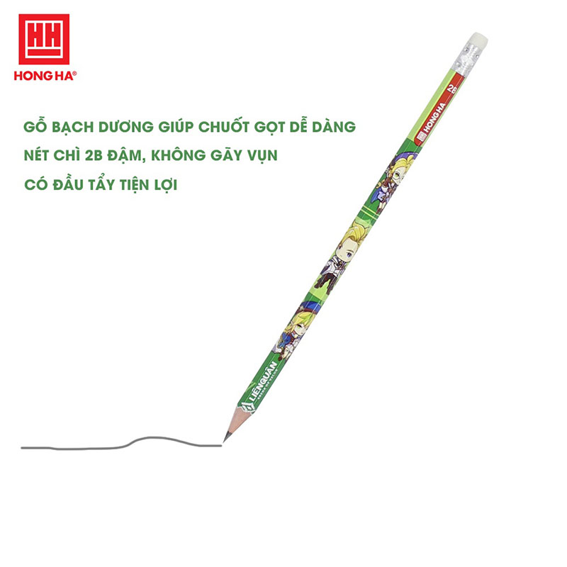 MÔ TẢ SẢN PHẨM: Bút chì Liên Quân 2B có tẩy (3530) sử dụng hình ảnh bản quyền Liên Quân độc đáo đang được nhiều bạn nhỏ yêu thích. Sản phẩm sử dụng chất liệu gỗ Bạch Dương bền chắc, ruột chì không bị gãy vụn khi viết, vẽ hoặc gọt. Thiết kế thân nhỏ gọn, hình lục giác dễ dàng cầm nắm và điều chỉnh nét viết - vẽ theo ý thích. Đầu bút kèm tẩy, tiện lợi cho người sử dụng. Sản phẩm phù hợp dành cho học sinh. THÔNG SỐ KỸ THUẬT: - Kích thước (D):190 (mm) - Ruột chì: 2B - Đường kính chỉ: Ø 2,4 mm - Chất liệu: Gỗ Bạch Dương mềm - Tẩy: Chất liệu cao su tổng hợp, màu trắng - Thương hiệu: Công ty cổ phần Văn phòng phẩm Hồng Hà - Xuất xứ: Việt nam. HƯỚNG DẪN SỬ DỤNG VÀ BẢO QUẢN: - Để sản phẩm ở nơi khô ráo, tránh xa nguồn nhiệt - Sau khi sử dụng, nên cất bút chì màu vào hộp cẩn thận, đậy nắp kín, tránh gãy và thất lạc màu chì.